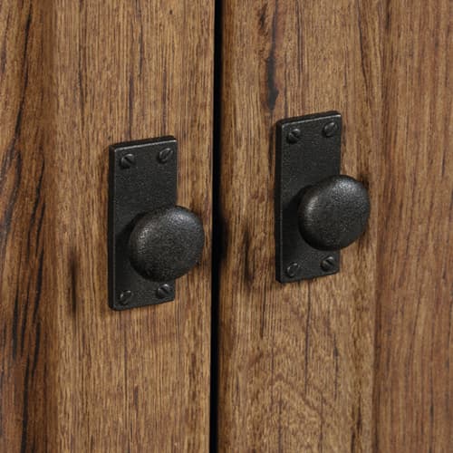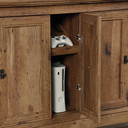 Sauder Palladia computer desk features a large drawer/shelf with flip-down panel for keyboard/mouse. Two small drawers with metal runners and safety stops. Lower drawer with full extension slides holds letter-size hanging files. Quick and easy assembly with patented T-slot drawer system. Vintage Oak finish.