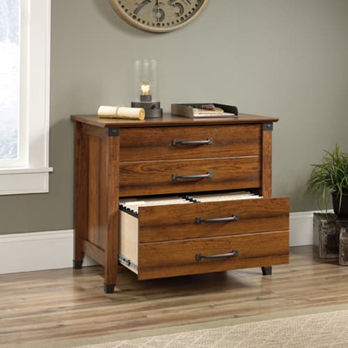 Sauder Carson Forge lateral file features drawers with full extension slides hold letter or legal size hanging files to help keep you organized. Patented, interlocking safety mechanism allows only one drawer open at a time to keep you and your family safe. Wrought iron style hardware and accents for an extra touch of class. Quick and easy assembly with patented T-lock drawer system. Washington Cherry finish.