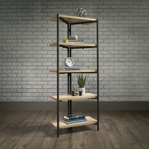 Sauder North Avenue bookcase features 1" thick shelves to hold books, photos, collectibles, and more. Finished on all sides for versatile placement. Powder-coated metal frame. Simple, no tools required assembly. Charter Oak finish.