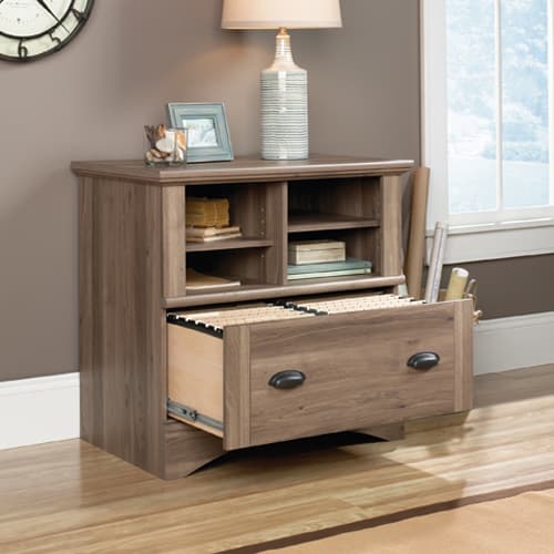 Harbor View lateral file features a locking drawer with full extension slides holds letter, legal, or European size hanging files. There is a cubbyhole storage with two adjustable shelves for flexible storage options. Salt Oak finish.