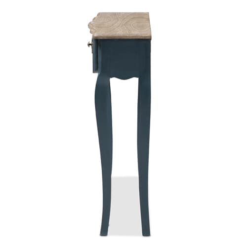 This Baxton Studio Mazarine console table will add a unique charm to your space. The classic and provincial inspired design comes through in the grey washed table top and the graceful curves of the table´s legs. It features a blue spruce finishing and the table´s drawer face has a scalloped edge, evocative of farmhouse and French style décor. The metal drawer knob has an ornate design and gold finishing.