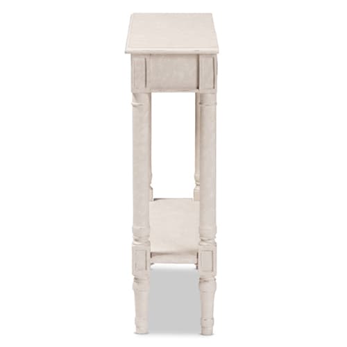 This Baxton Studio Ariella 1 drawer console table will add an element of romance and bygone times to your home. The country cottage farmhouse inspired design is evident in the amount of detail put into this console table. It features 1 pull out drawer and 1 bottom shelf for added convenience. The whitewashed finish of the piece and a charming, dark bronze finished drawer pull gives the console table a bit of antique style.
