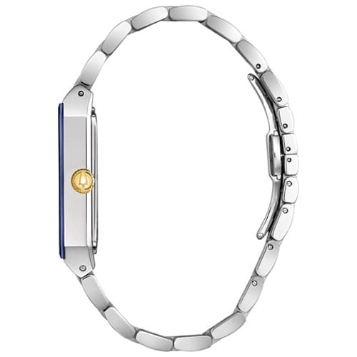 This Mens Bulova Quadra two-tone bracelet watch is a new tank style. It features a silver-tone stainless steel case with edge to edge blue faceted metalizing mineral crystal, and a gold-tone crown. The blue dial includes three sparkling diamonds set on the 3, 6, and 9 o’clock hours. Water resistance to 30 meters. 30mm x 45mm.Limited Manufacturer´s Warranty.