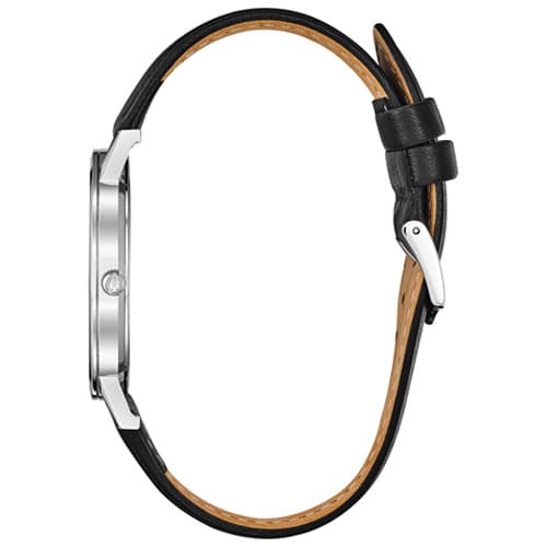 This Mens Bulova American Clipper black leather strap watch is a masculine and classic design that he is sure to love. It features a sharp silver tone stainless steel case and black leather strap with a simple three-piece buckle closure. The silver white dial showcases Roman numeral markers, a date window with a flat mineral crystal, and a quartz movement. Water resistance to 30 meters. Case Size: 40mm.Limited Manufacturer´s Warranty.