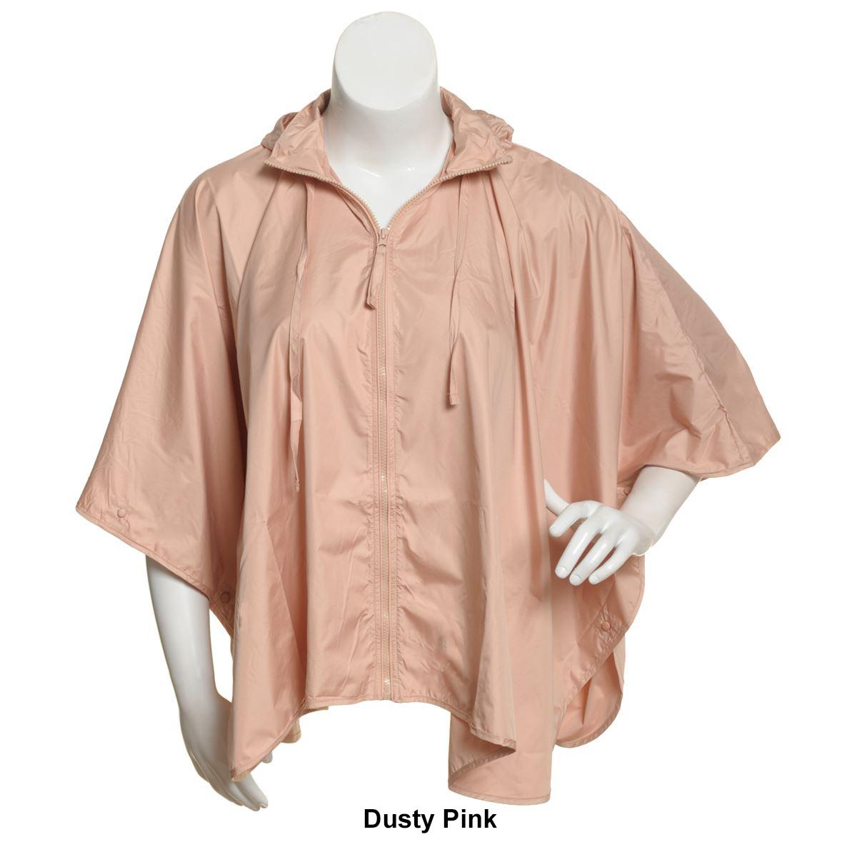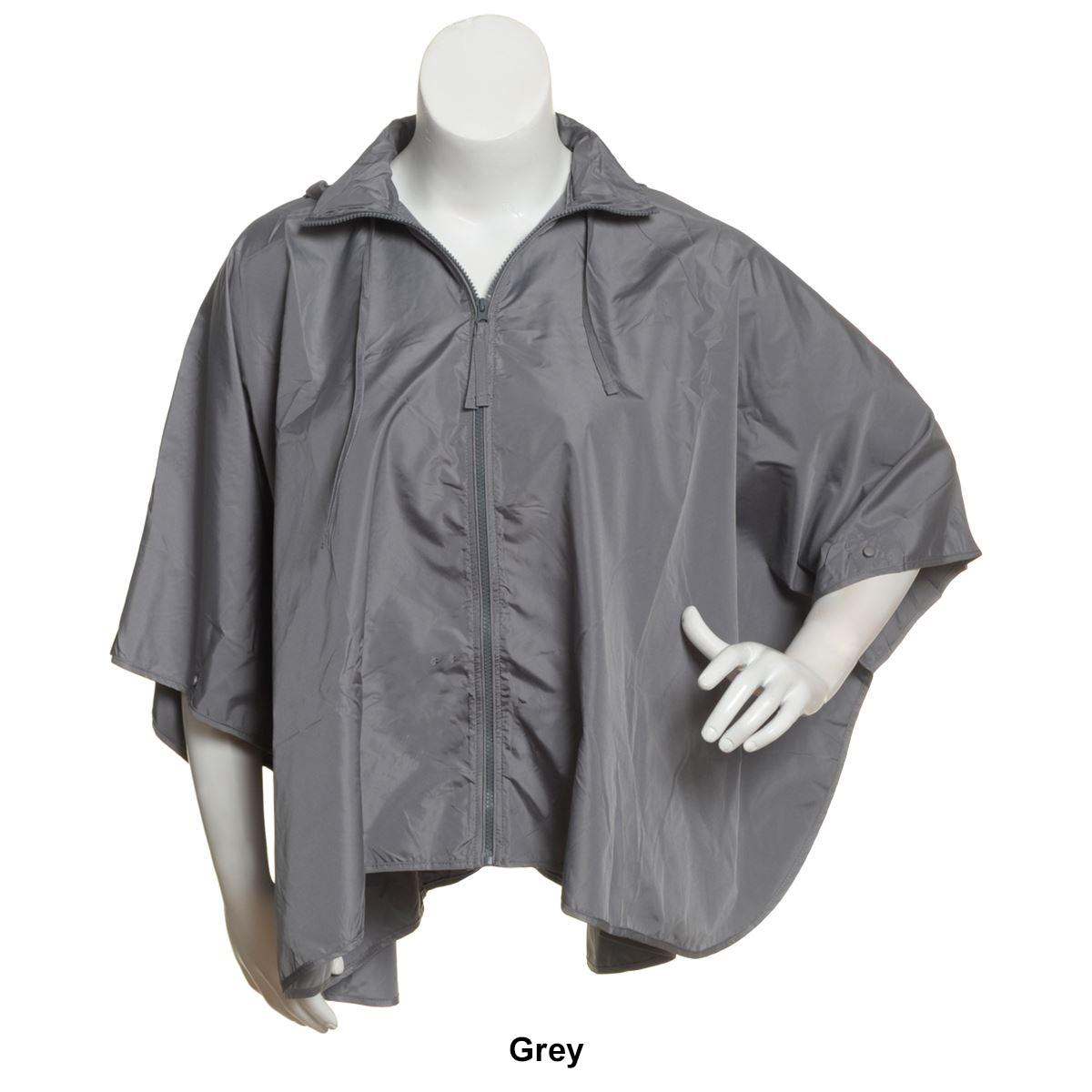 The Womens Capelli New York solid sporty rain cape with a front zipper and a collar features a tucked in hood and is water repellant.