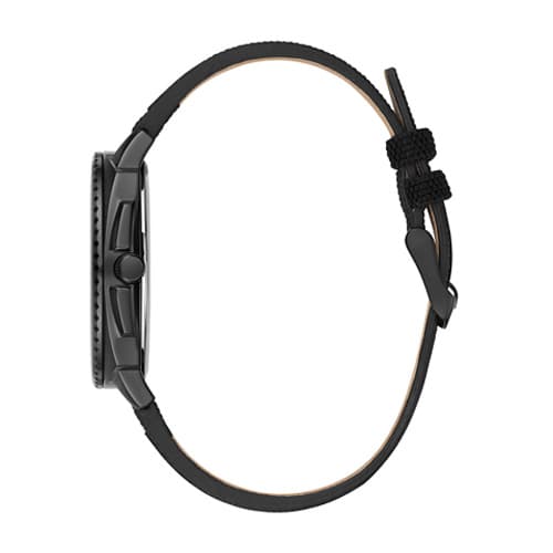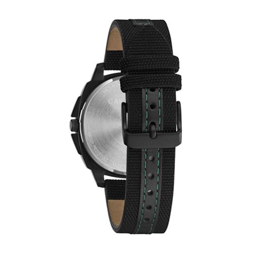 This Mens Caravelle nylon and leather strap watch features a bold black multilayered dial with a carbon fiber weave pattern on inner core. Other features include off raised dimensional hour markers that are outlined in green, a date feature at the 6 o’clock hour, a cushion shaped black IP stainless steel case, and black nylon/leather strap with green stitched accents. It is finished with a simple wire buckle closure. Water resistance to 50 meters. Case Size: 41mm.Limited Manufacturer´s Warranty.