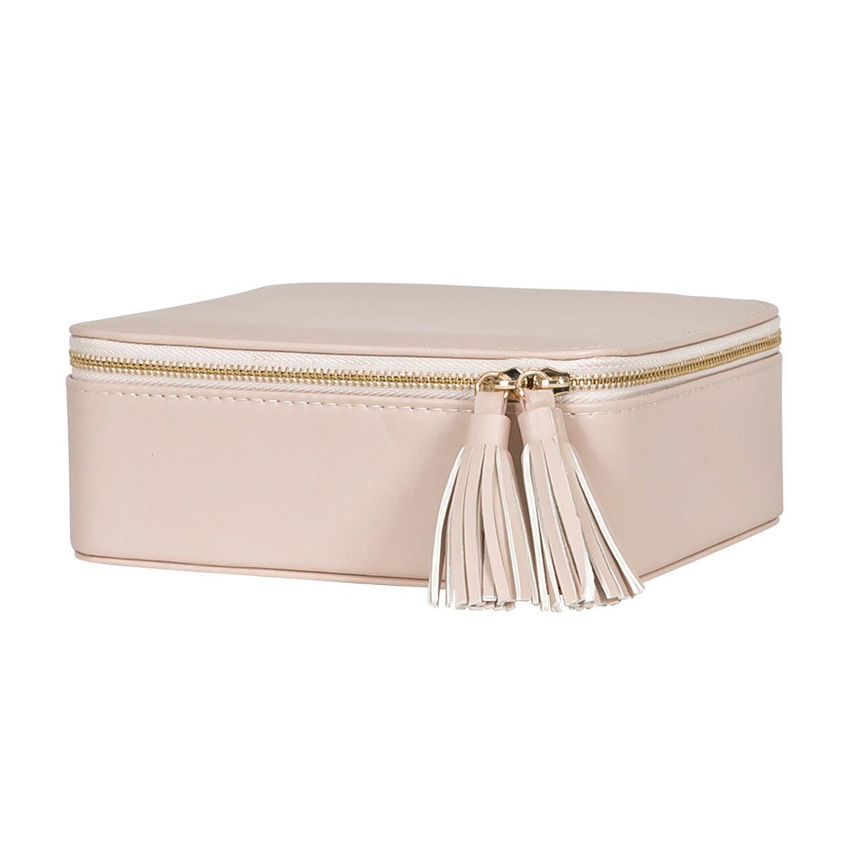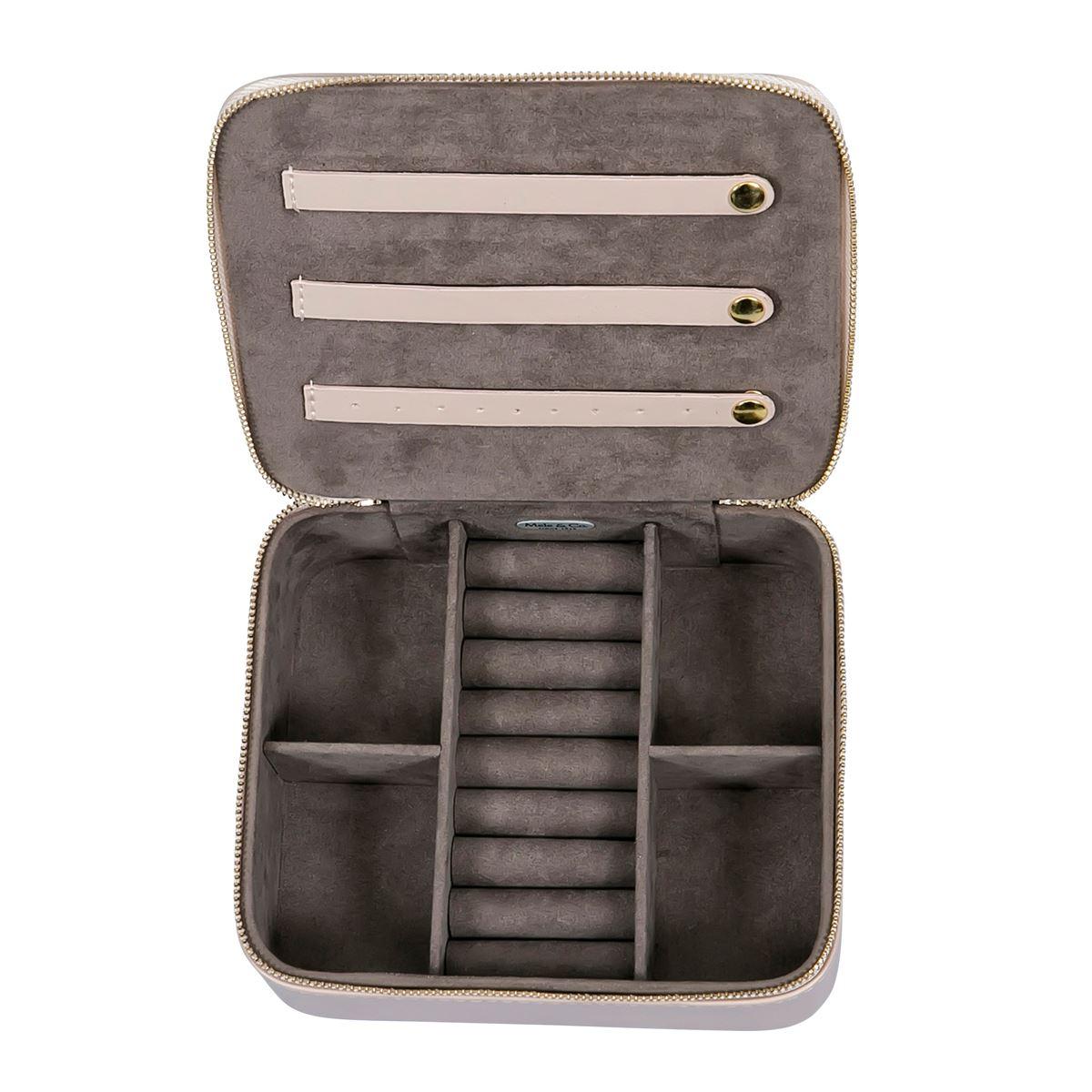 This Mele & Co. Shiloh travels faux leather jewelry case is classy and sassy with all the sophistication and storage a girl needs. With its sleek profile, velvety fabric lining, and tasseled zipper pulls, you´ll find it simply irresistible! The interior lid features 3 jewelry straps, 1 with 9 holes to accommodate pierced earrings. There is a single compartment that offers 4 open area sections plus a central ring roll section. It features a gold tone zippered closure with 2 self-color faux leather tasseled zipper pulls and is hand lined in grey suede fabric.