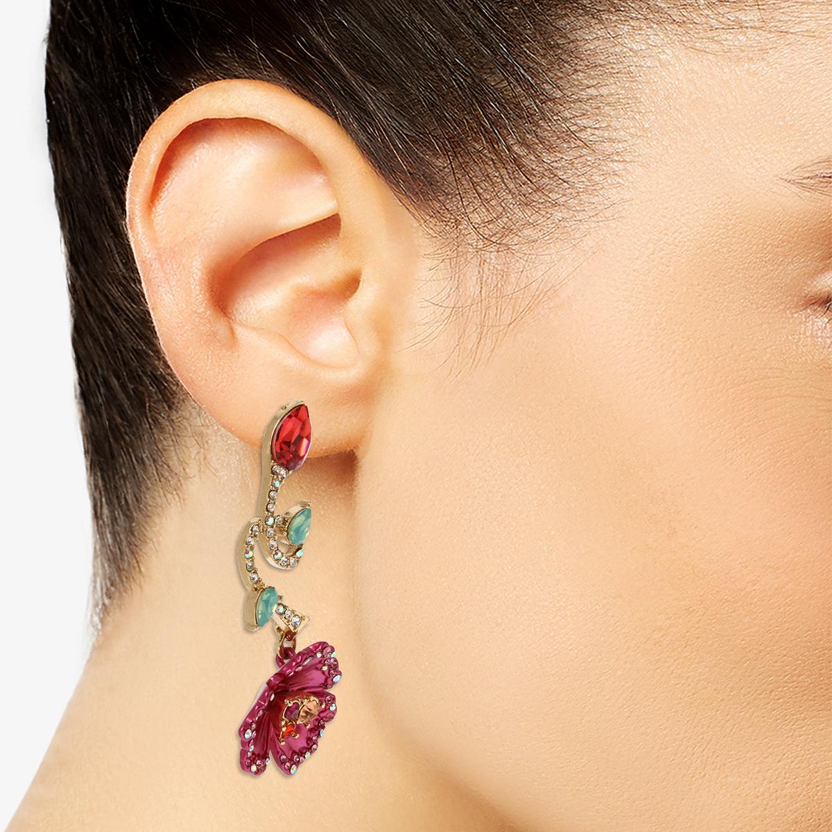 These Betsey Johnson mismatch drop earrings showcase fuchsia flowers that have pave effect stone accents and mixed stones. From the Opulent Floral Collection.