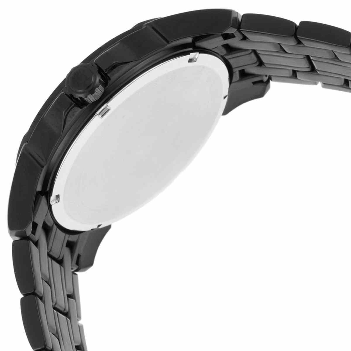 This Mens Bulova multifunction bracelet watch is from the Classic Collection. Its design is in stainless steel with a black ion plated finish, a patterned black dial, day, date, and 24-hour sub-dials, and a screw back case. It is finished with a simple double press fold over clasp with safety lock, and is water resistant to 30 meters.