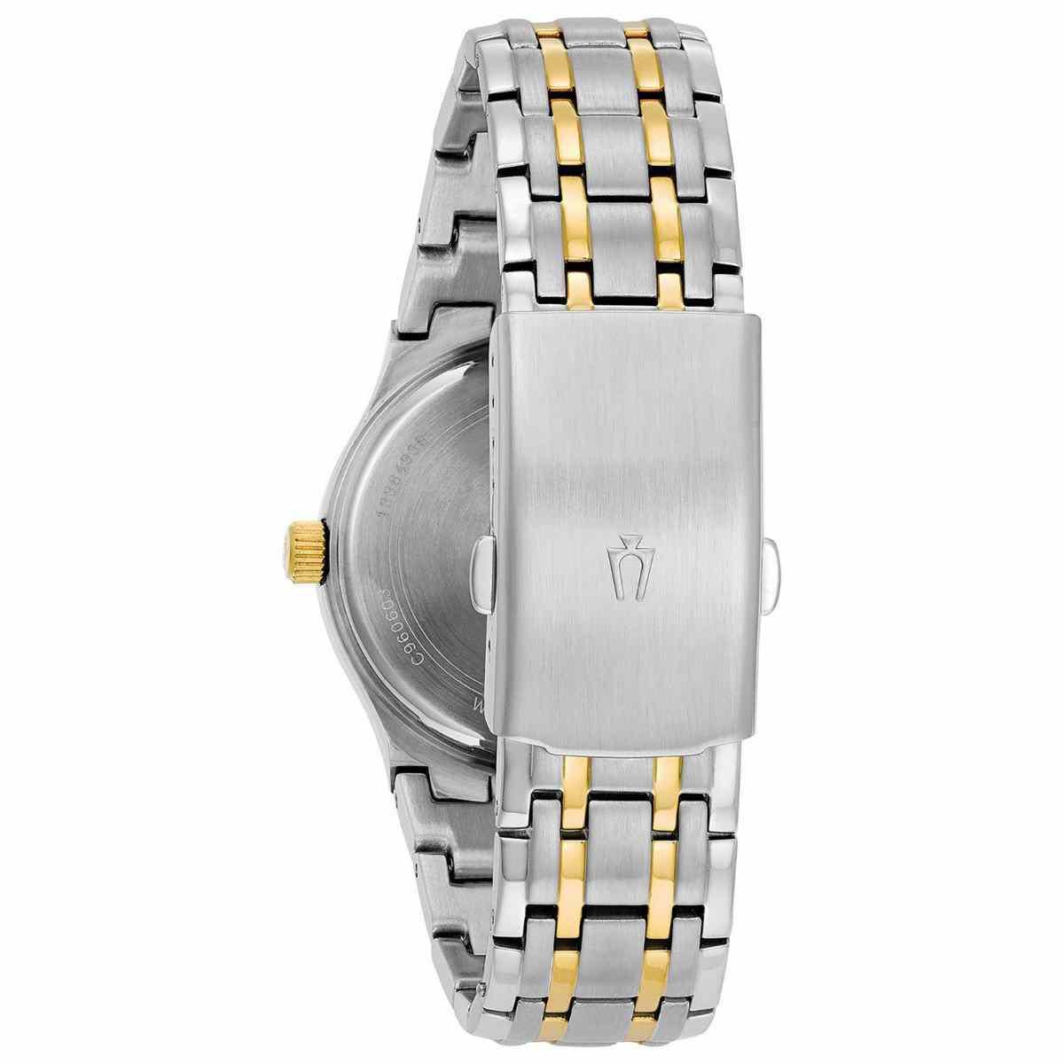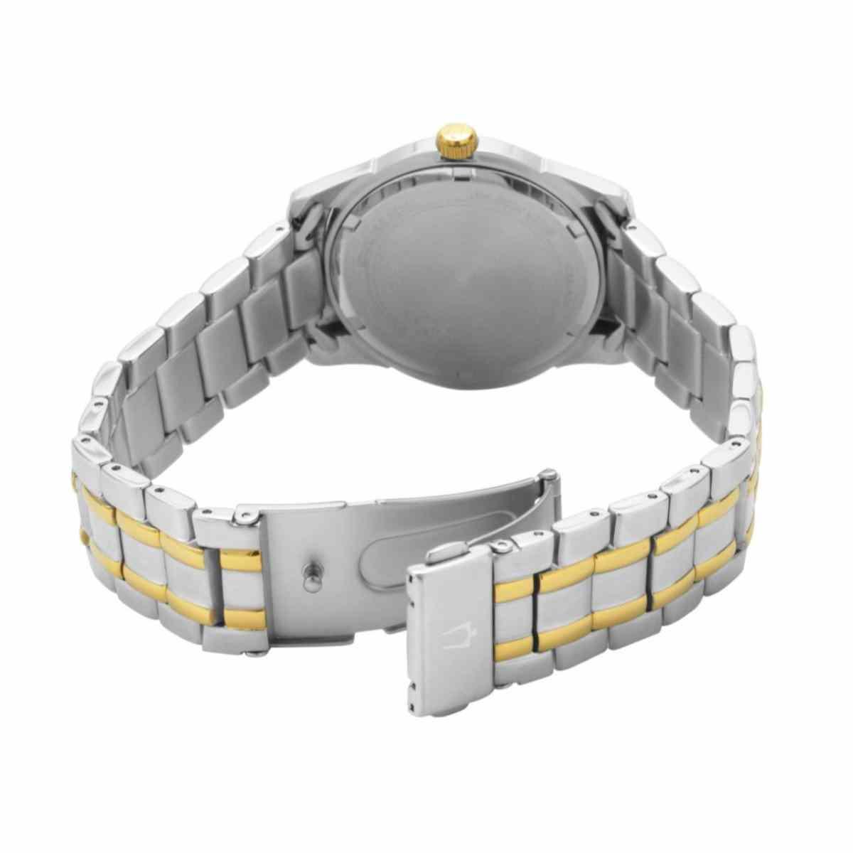 This Mens Bulova bracelet watch is the perfect and sophisticated accent for any occasion! Its design shines in polished gold plated stainless steel. The large round steel case is featured on a handsome and durable steel link bracelet with gold tone accents and a push-button fold over clasp for closure.
