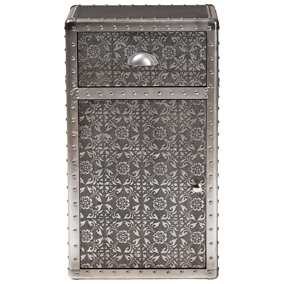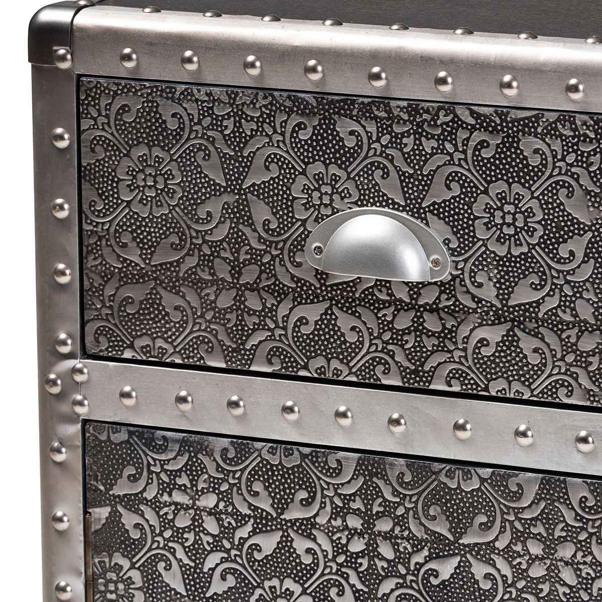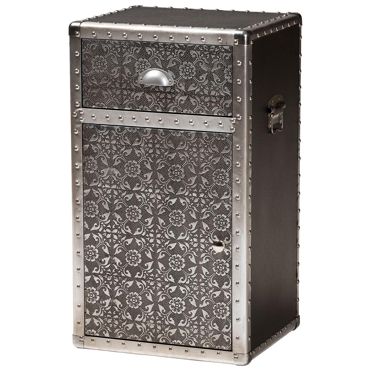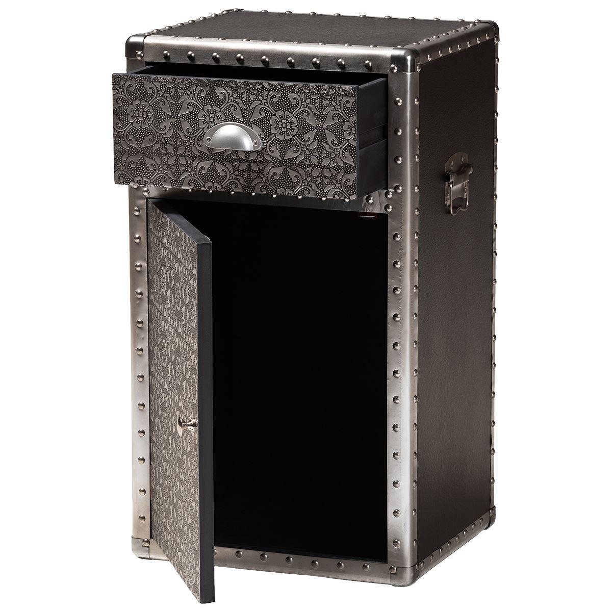 This Baxton Studio Cosette Collection floral accent cabinet is a great way to refresh your home décor. Its industrial inspired style is fitted with one drawer and one concealed compartment. The drawer face and door face each display an intricate floral embossed pattern reminiscent of Spanish tile motifs, with silver metal handles and rivet detailing along its edges. Use this cabinet as an accent piece in the foyer, living room, or bedroom.