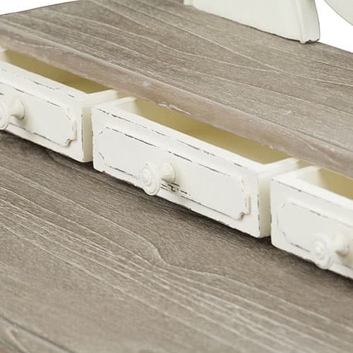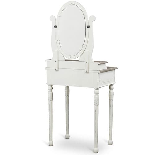 The Baxton Studio Anjou Dressing Table & Mirror features four drawers and two shelves that combine to make the most of available space. Genuine mindi wood tops and a distressed finishing offer a spectacular look. Wipe with a dry cloth. Materials: Mindi wood and MDF. Dimensions: 55.8”H x 23.75”W x 15.75”D.