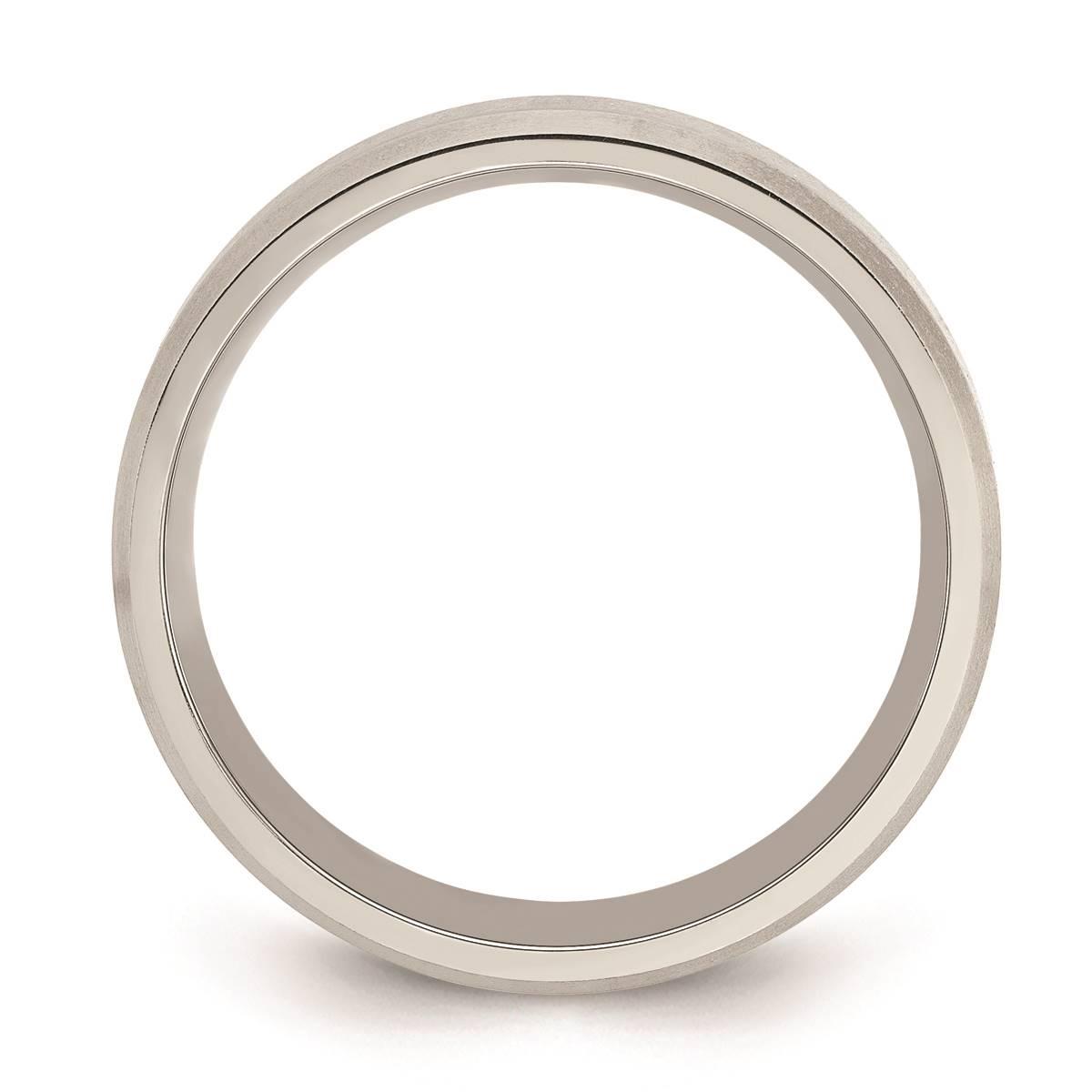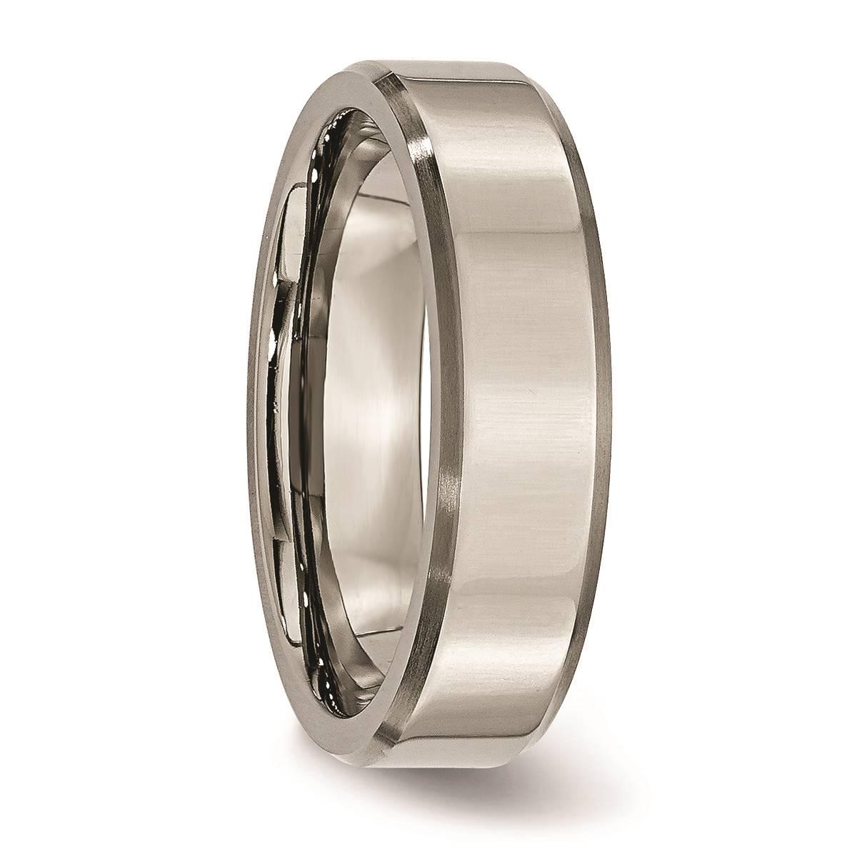 This Mens Fine Jewelry Collections Endless Affection™ titanium 6mm beveled edge wedding band is a beautiful way to say I Do! Its design can be engraved and includes a domed design for a comfort fit with an elegant look.