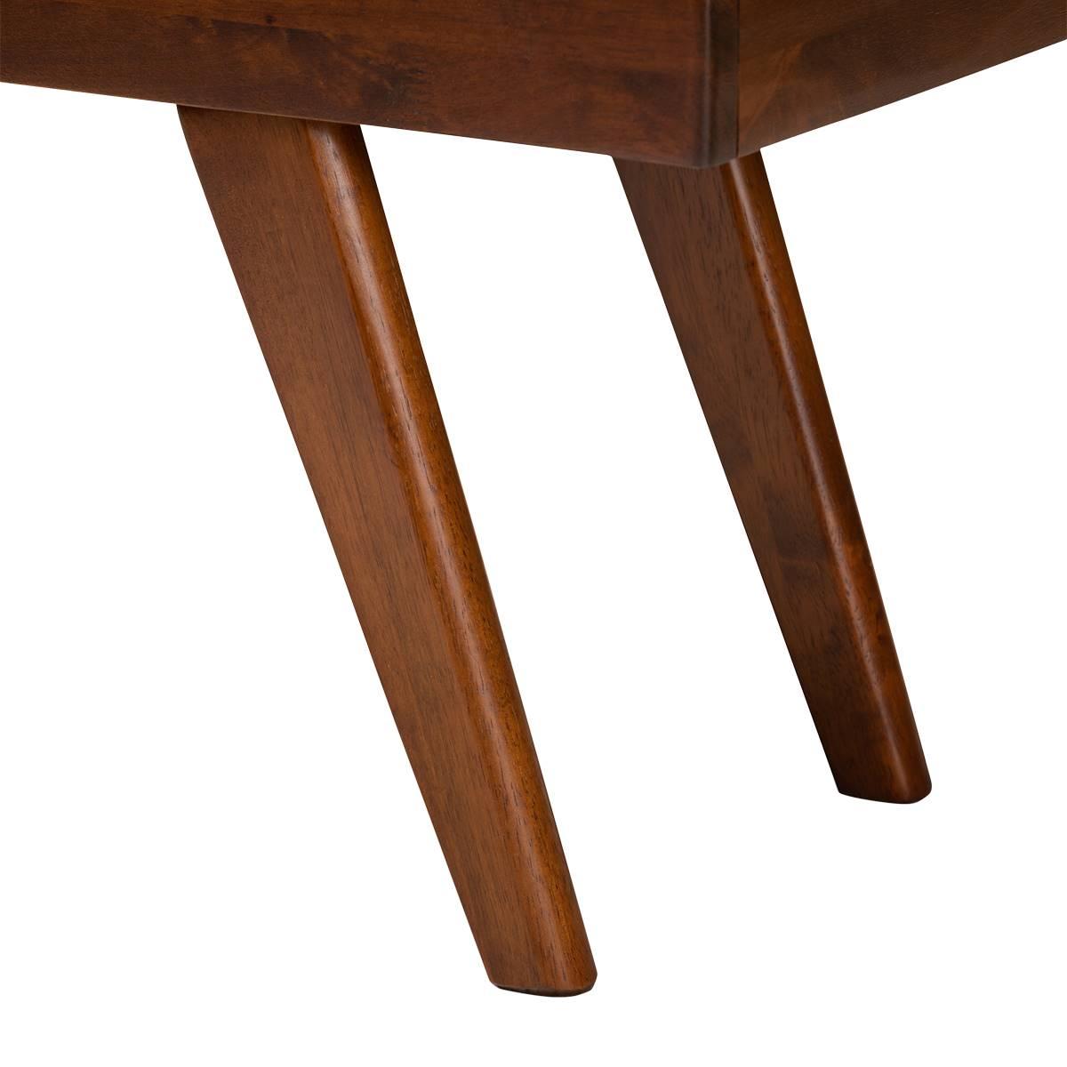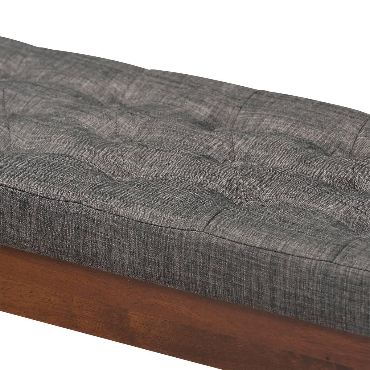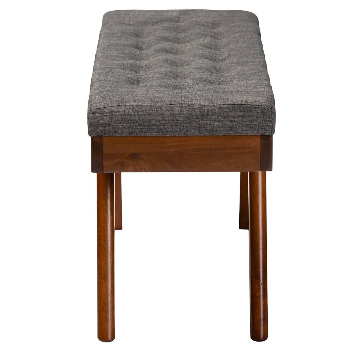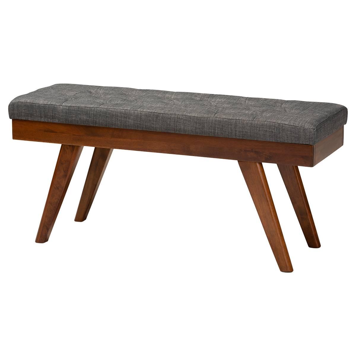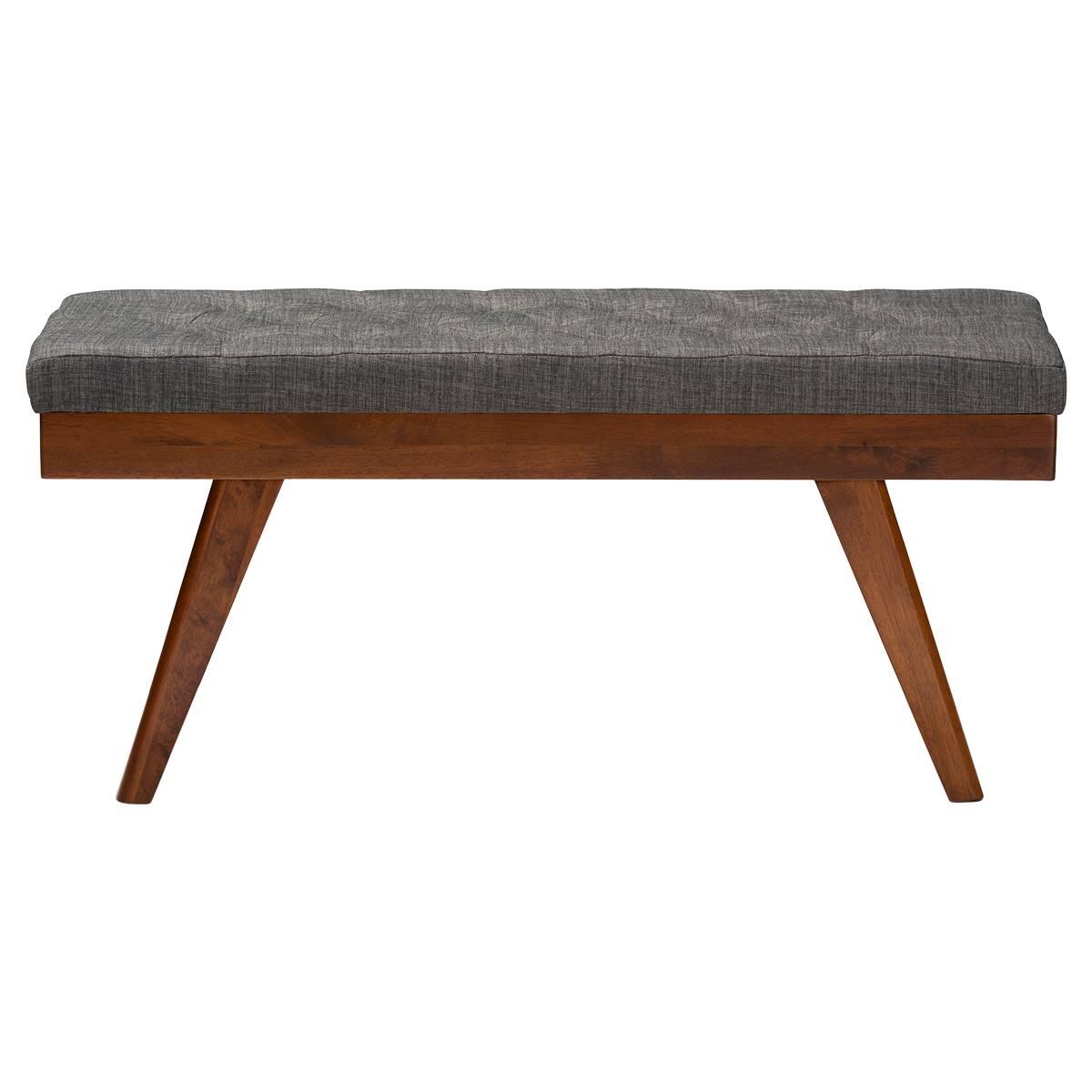 This Baxton Studio Alona wood dining bench is a great way to add some visual interest to your dining room setup. This wood bench is upholstered in a soft, polyester fabric that is complementary to the walnut brown finished wood and angled, tapered legs. This versatile piece works well as seating at a dining table, or is equally suitable for use as an accent piece in your entryway.