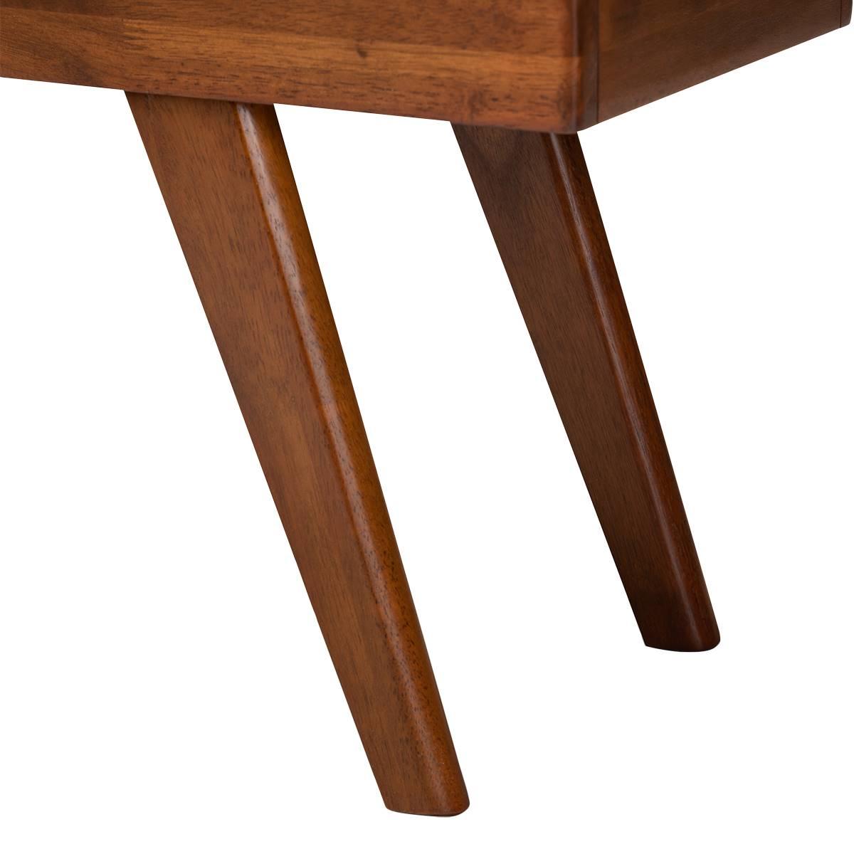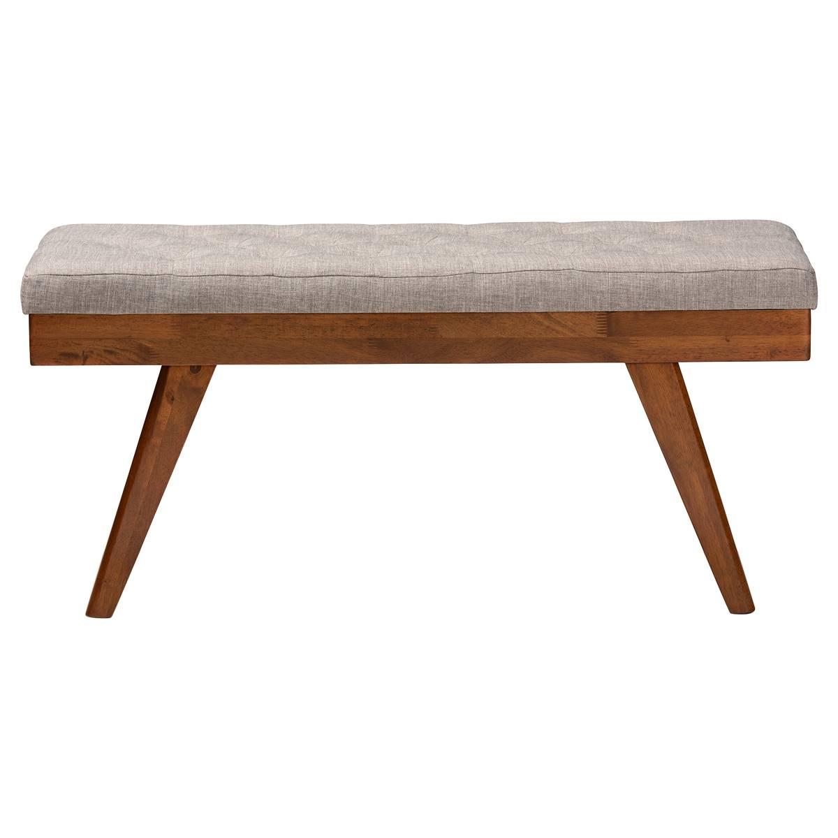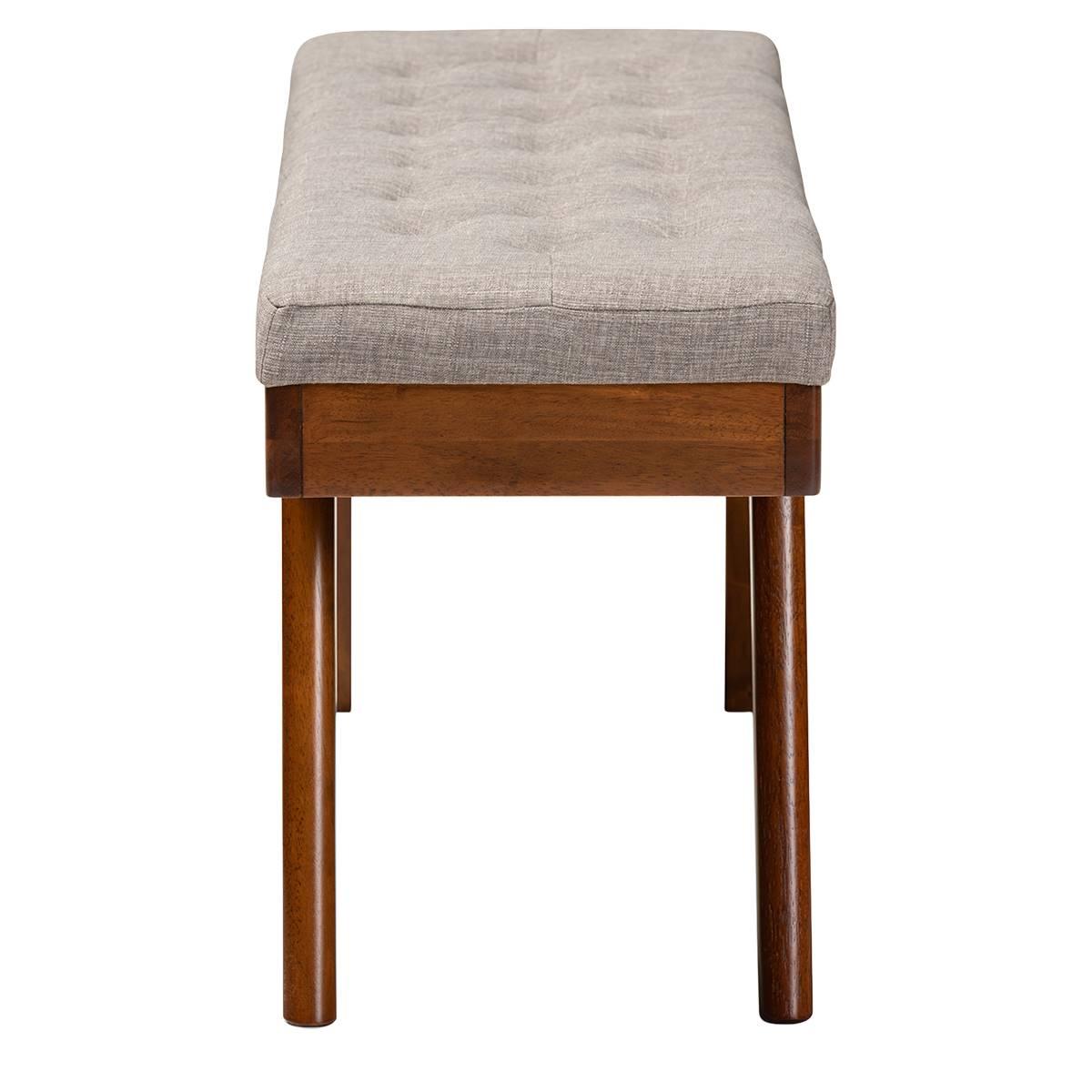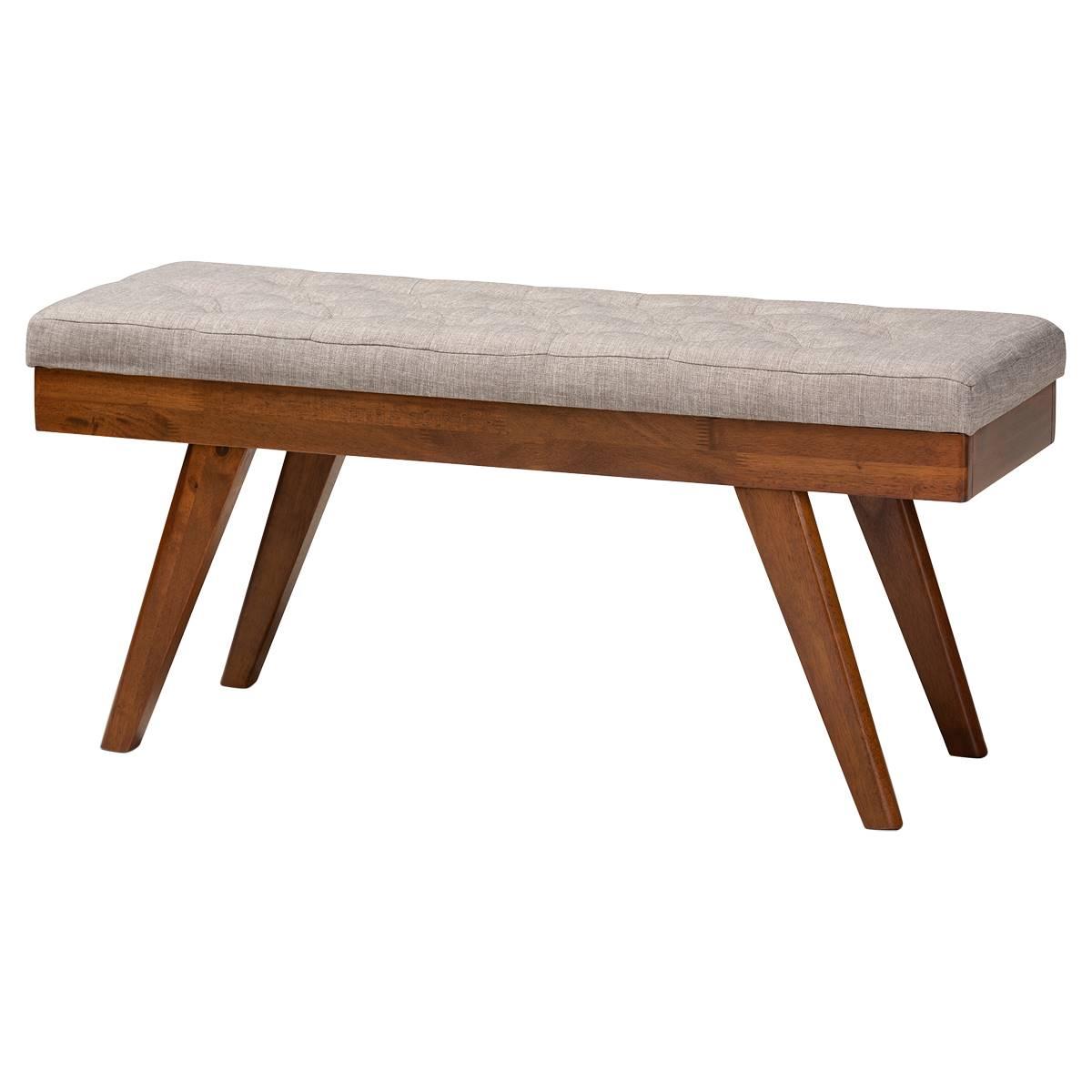This Baxton Studio Alona wooden dining bench is a great way to add some visual interest to your dining room setup. This wood bench is upholstered in a soft, polyester fabric that is complimentary to the walnut brown finished wood and angled, tapered legs. This versatile piece works well as seating at a dining table, or is equally suitable for use as an accent piece in your entryway.