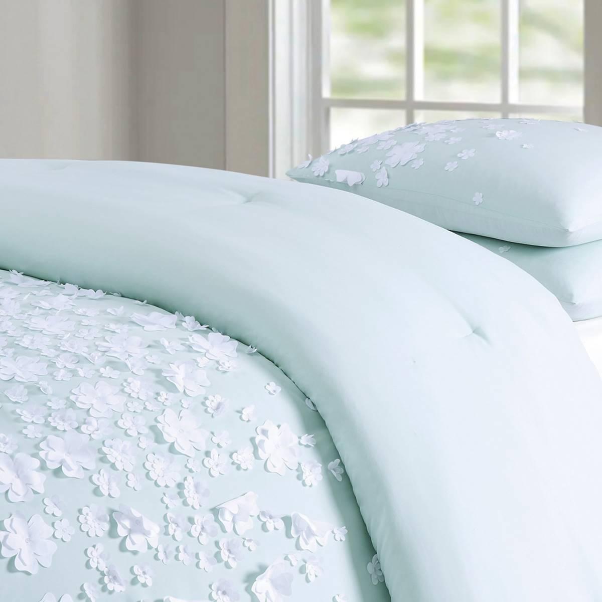 This Christian Siriano New York® Confetti Flowers duvet cover set will make a lovely addition to your bedroom décor. The design showcases a masterful combination of a simple solid color design with the delicate touch of three dimensional floral appliqued flowers of various sizes on the face fabric. The comforter base fabric comes in a variety of colors for easy coordination, but the magic comes from the white floral blooms that are sewn to the face of the comforter and stand out from the face of the bedding.
