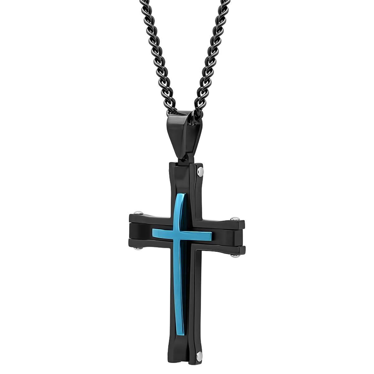 Wear a token of your faith with a contemporary cross pendant crafted in long lasting stainless steel. This stacked two tone cross pendant is a timeless accessory with the blessing of protection – an ideal gift for men for any occasion. Black ion plating on the base cross lends a nice contrast to cobalt blue accents. Beveled edges highlights and gives this accessory piece extra dimension. A durable lobster claw clasp on a 24-inch curb chain secures the pendant so you never have to worry losing it. The pendant and the included stainless steel chain are tarnish-resistant and hypoallergenic. The back surface is smooth and can accommodate engravings.