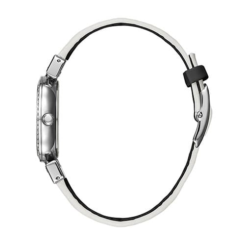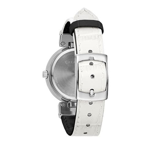 The Womens Caravelle reversible leather strap watch showcases a stunning crystal dial in stainless steel with 50 individually hand set crystals on its bezel. It features a stainless steel case with a swiveling and reversible black-to-white croco leather straps and a wire buckle closure for an easy transition. This watch is also water resistant up to 30 meters. Case Dimensions: 32mm.Style 43L208.Limited Manufacturer´s Warranty.