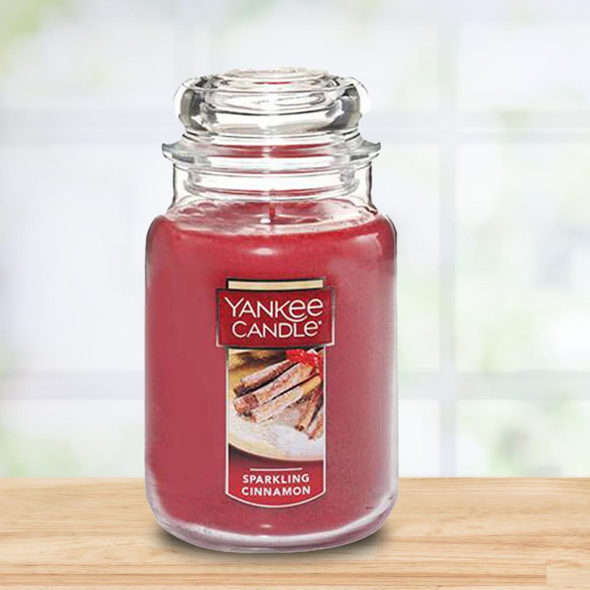 The Yankee Candle® 22 ounce sparkling cinnamon jar candle brings the holiday glow…the spicy warmth of real imported stick cinnamon with a hint of cloves to your home this winter. This candle is made with Yankee Candle´s pure, natural extracts and features a hand-straightened wick for the best possible burn. This 22 ounce candle has a burn time of 110-150 hours.