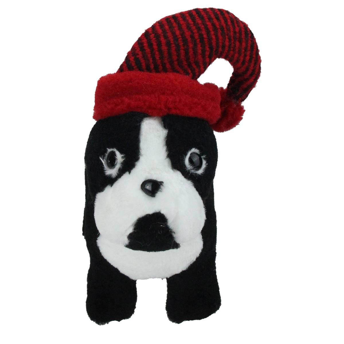 Every day is Christmas for a dog surrounded with love. Perfectly plush this adorable Northlight Seasonal 11.5 inch standing bulldog with a red hat makes a wonderful Christmas companion. A wonderful gift for the puppy lover in your life! Black and white standing bulldog wearing a striped black and red hat and collar. It comes with a bendable hat for easy customization.