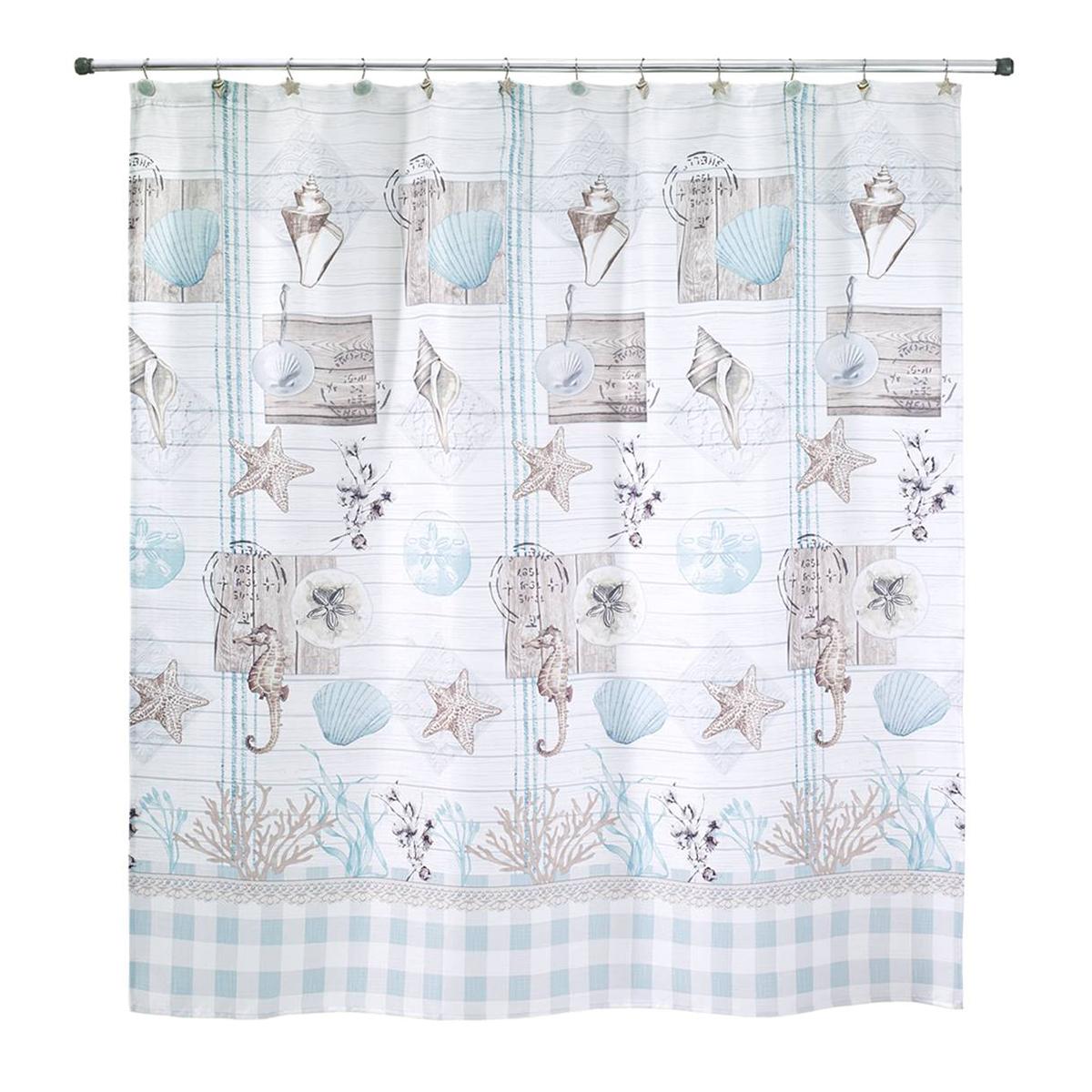 Description The Farmhouse Shell printed shower curtain features a collection of sea creatures, shells, starfish, seahorses, and coral in pleasing shades of blues and beige´s...