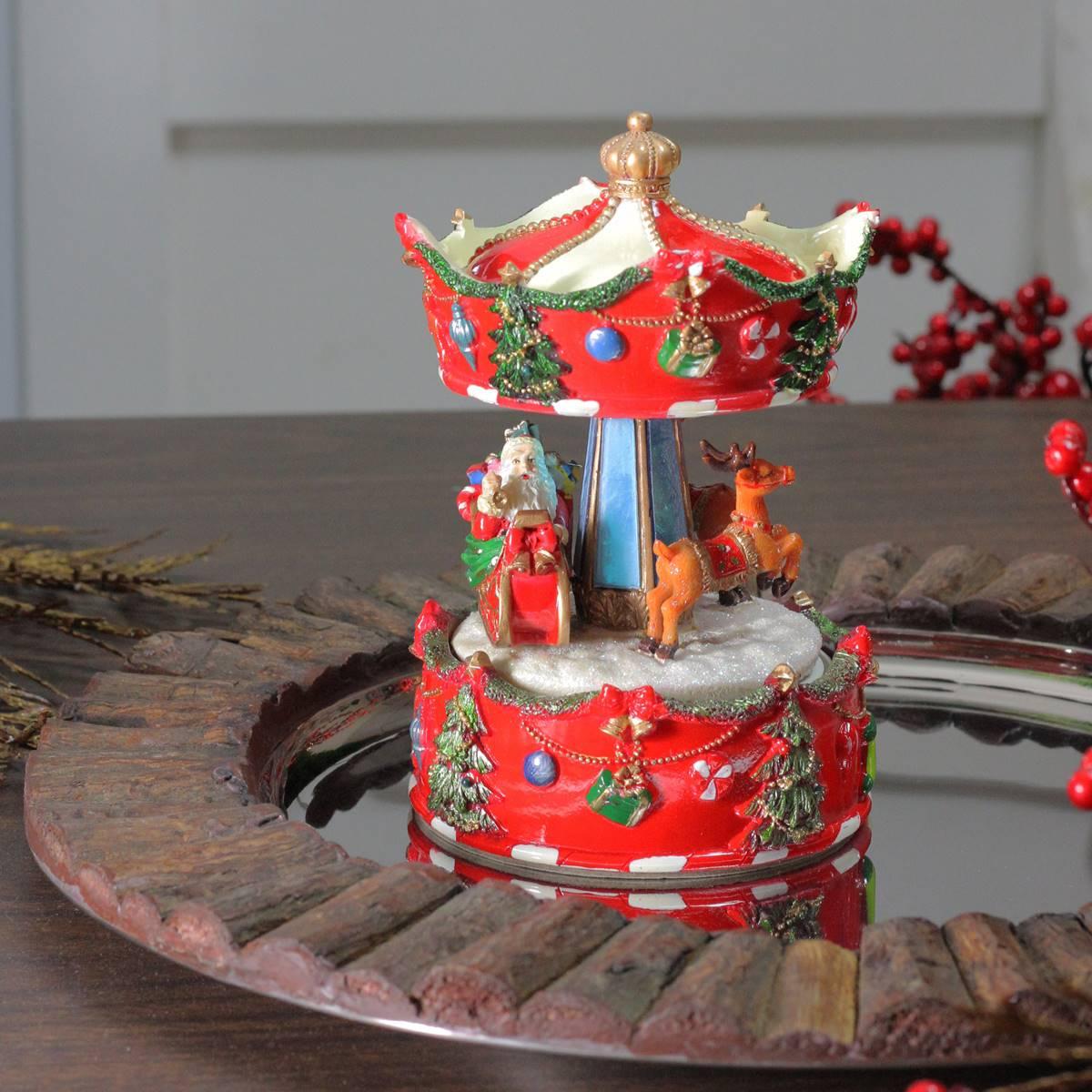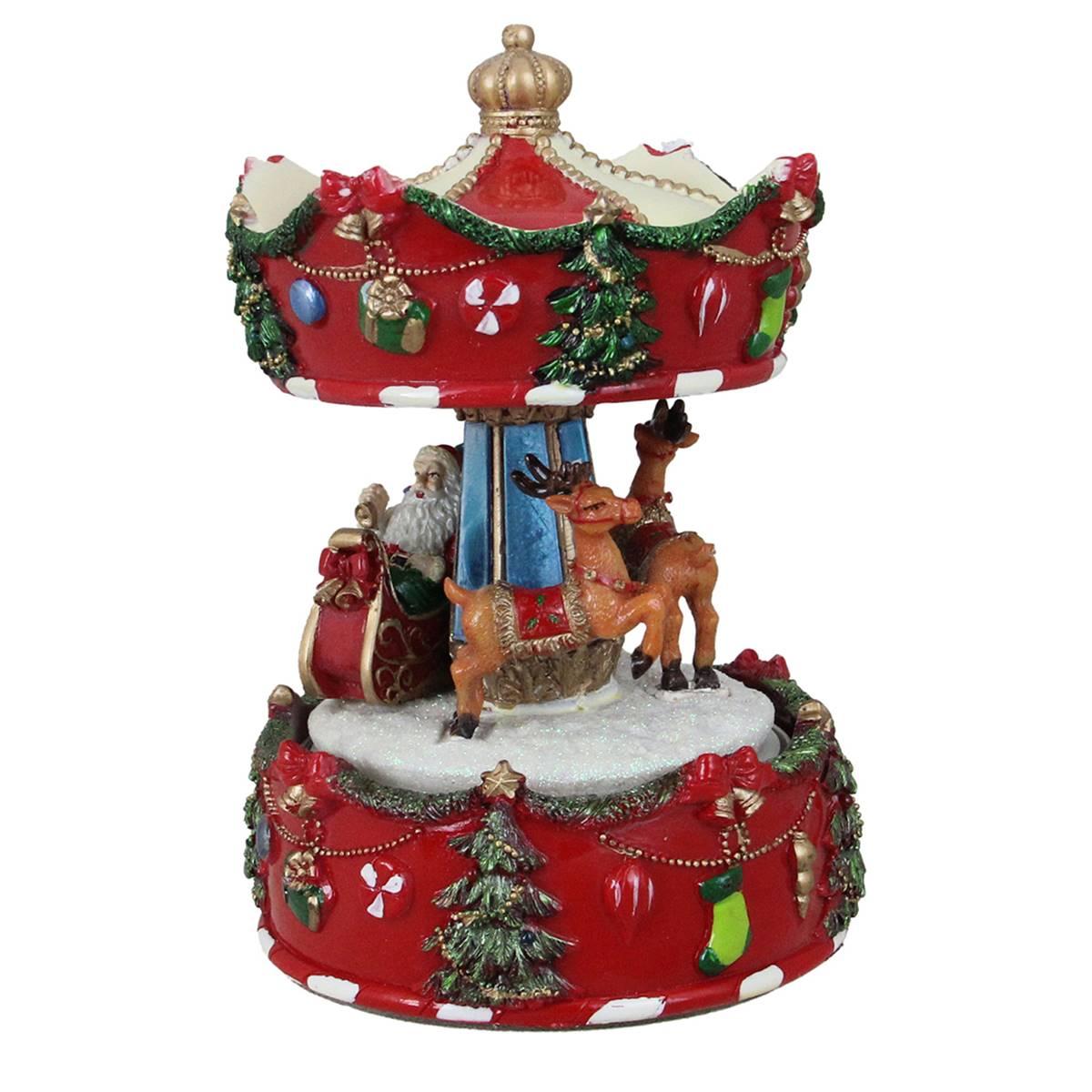 Add a touch of carnival to your Christmas tabletop decor with this beautiful and dainty Northlight Seasonal 6.75 inch animated musical carousel Christmas decoration. Traditional Santa and reindeer riding the carousel into the holiday season would make even Scrooge smile. Perfect to add to your holiday decor or to give as a gift. This Santa and reindeer carousel features a red colored background adorned with Christmas decorations. Winds up by turning clockwise and plays "We Wish you a Merry Christmas" while the canopy, Santa and reindeer rotate.