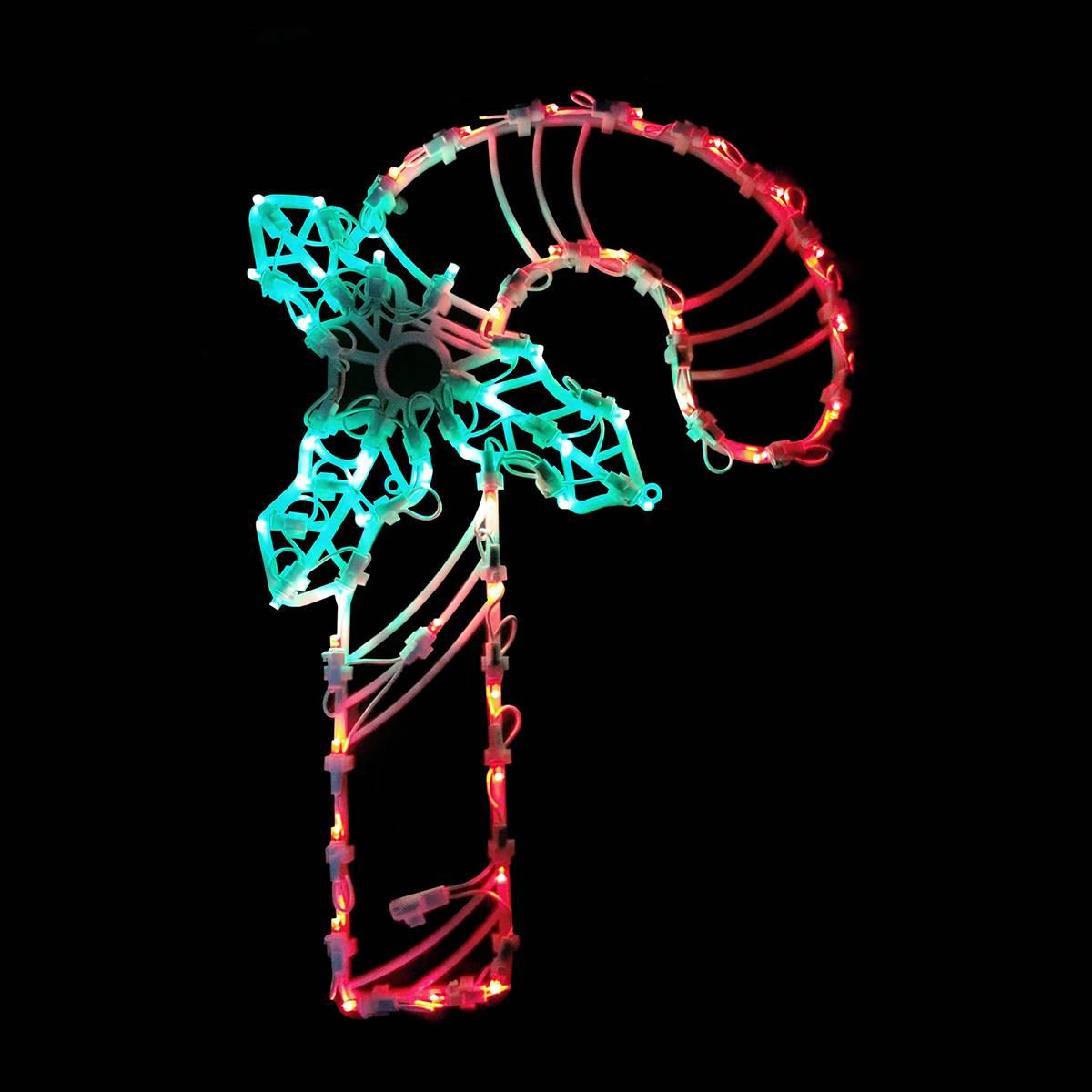 Decorate your windows, walls or mantel with ease using this one piece Northlight Seasonal 18 inch LED candy cane window silhouette featuring a candy cane with holly leaves. Pre-lit with 50 red and green mini LED bulbs with white wire. The LED lights use 90% less energy than incandescent bulbs and are non-glass and cool to the touch. These lights are UL listed for indoor or outdoor use. Comes with replacement bulbs, spare fuses and a suction cup for mounting. If one bulb burns out the rest will stay lit. This double-sided design contains 1 plug with end connector which allows you to stack multiple lighted items together, but do not exceed 210 watts.