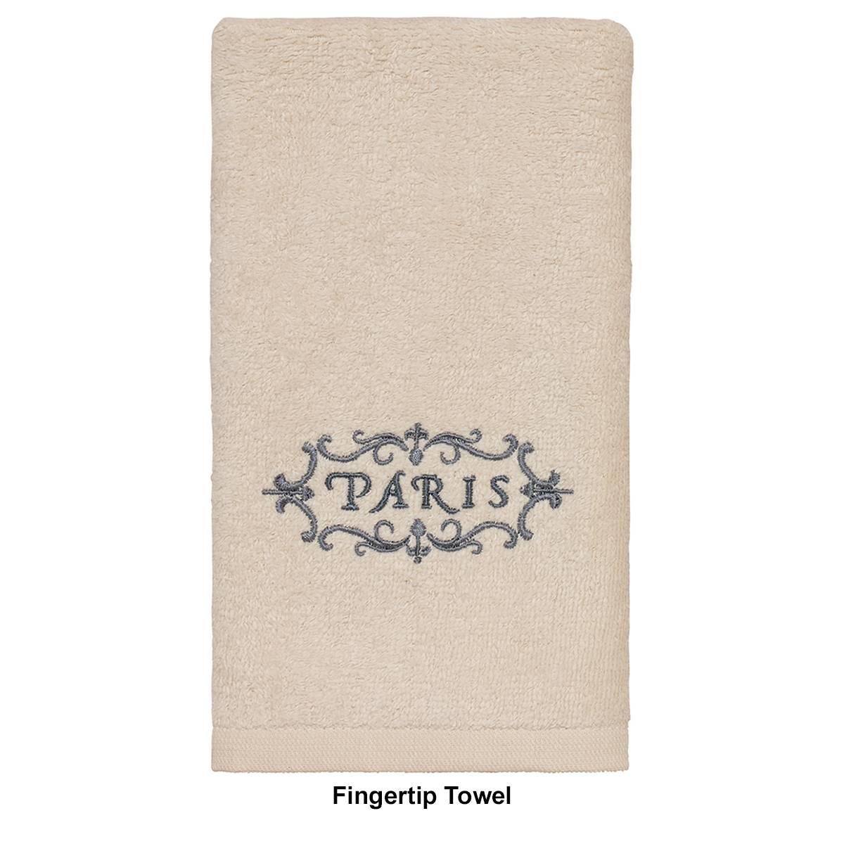 The Avanti Paris Botanique towel collection features an embroidered gold Eiffel Tower surrounded by the word "Paris" written in grey with flowers and vines on an ivory velour towel. The towel is finished with a two-tone coordinating fabric border.The fingertip towel features an embroidery of "Paris" in grey surrounded by scrollwork on an ivory velour towel.