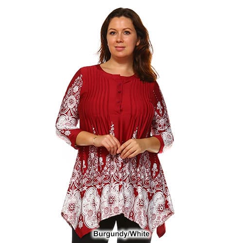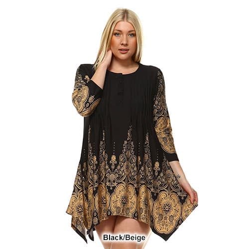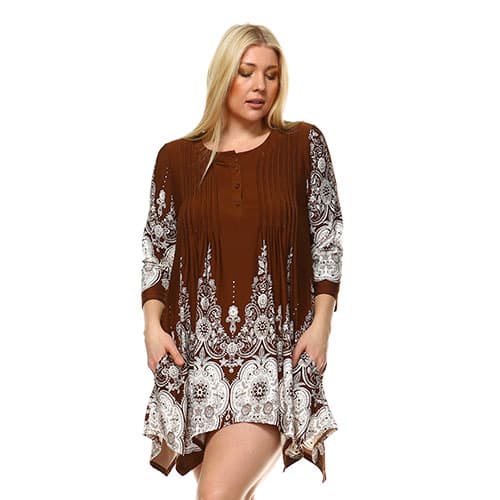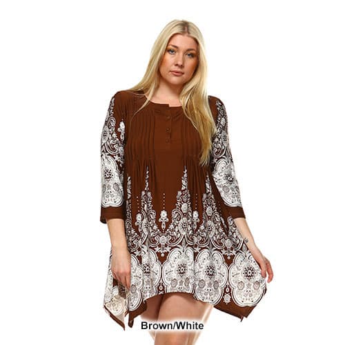 The Plus Size White Mark Dulce shift dress adds style and fun to your everyday wardrobe! The 3/4 length sleeves and scoop neck design introduce a sense of fun while the tunic design flows out from the bottom for comfort. Hand wash. hang dry. 95% Polyester. 5% Spandex.