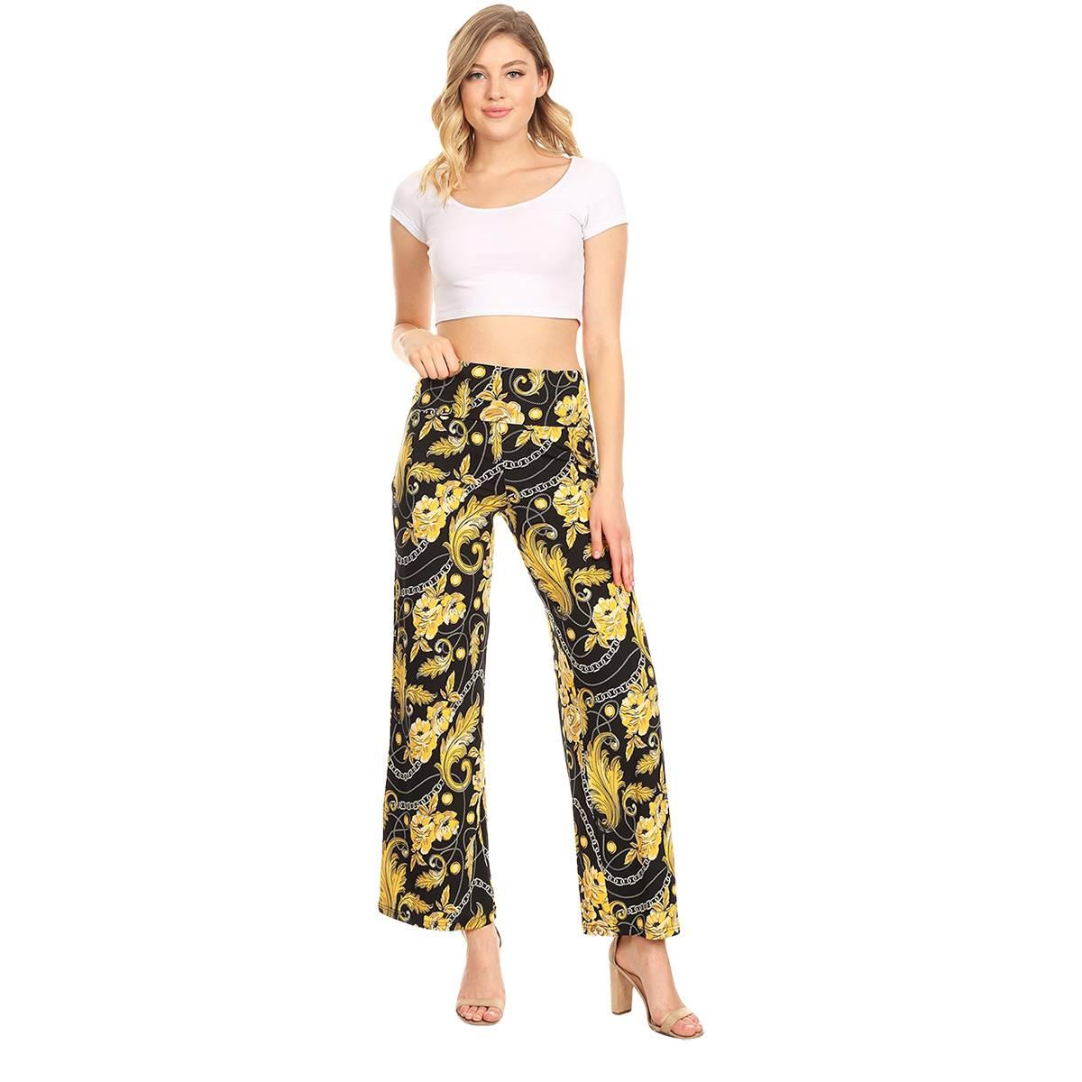 Amp up your wardrobe with these Womens White Mark popular wide-legged palazzo pants in a black and gold print. You will feel comfortable and relaxed, yet well-dressed for any occasion. Made with premium quality stretchy knit.