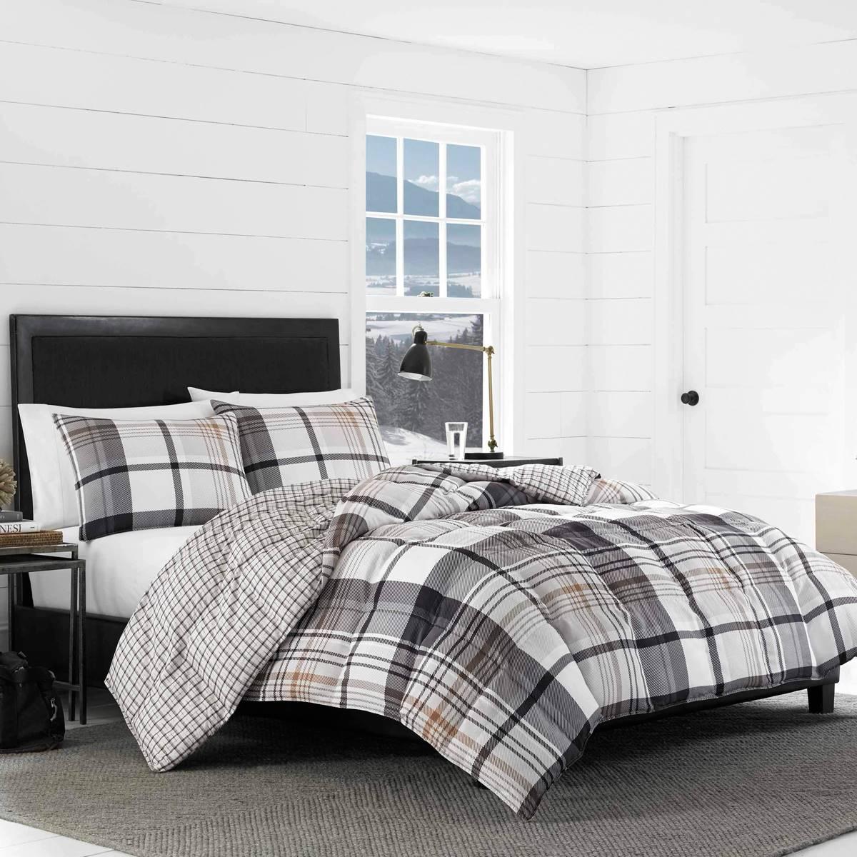 Soft and silky brushed microsuede lends extra warmth and comfort to this Eddie Bauer Normandy Plaid reversible comforter set. The plaid pattern creates a fresh, modern attitude for this classic design and the sophisticated neutral palette of black, beige, and white with a color accent of coppery tan will complement both rustic and modern decor.