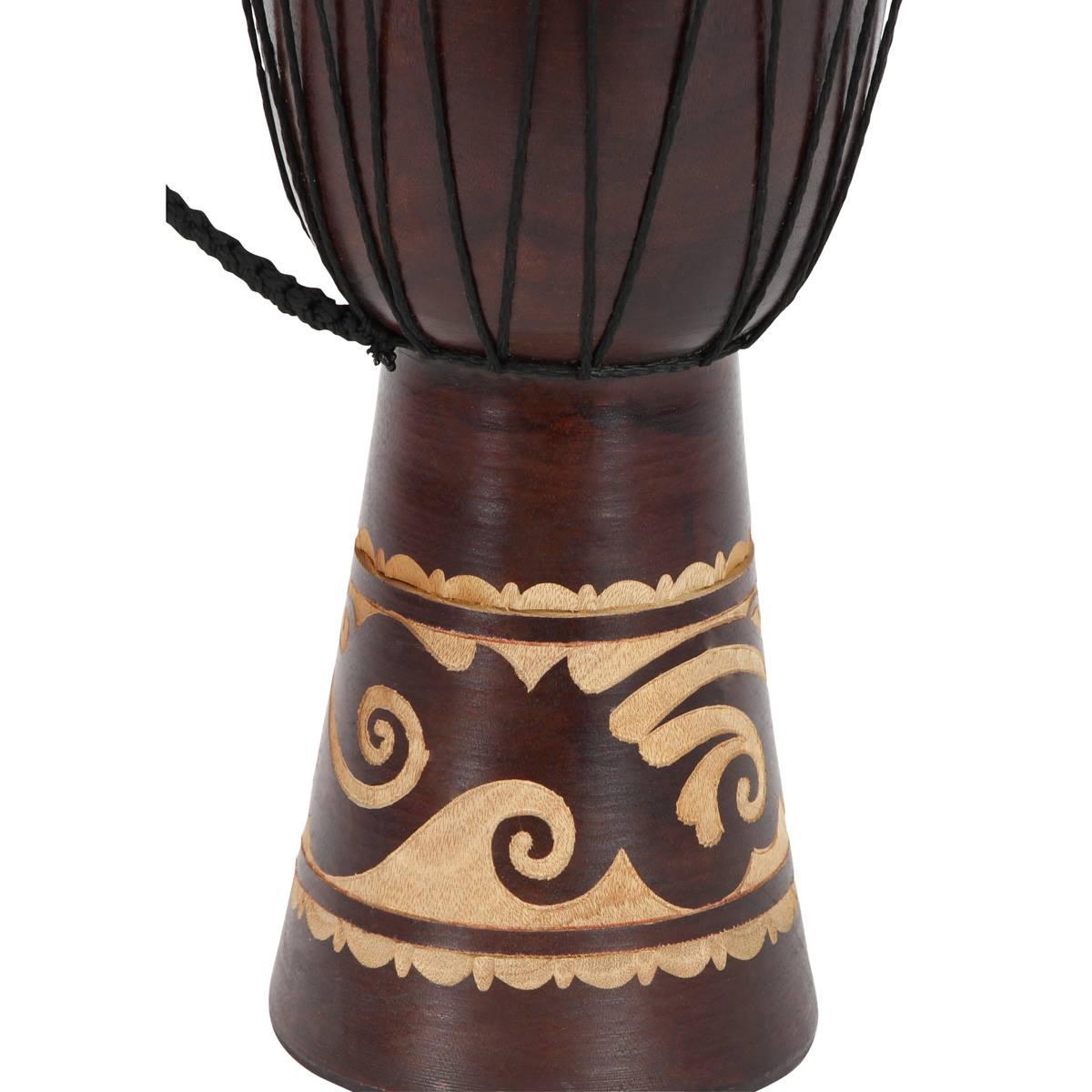 Add this 9th & Pike® as an accent piece to any room. The brown mahogany drum features a traditional Aztec drum with ropes strung along the top and images along the bottom.