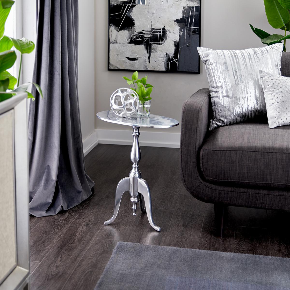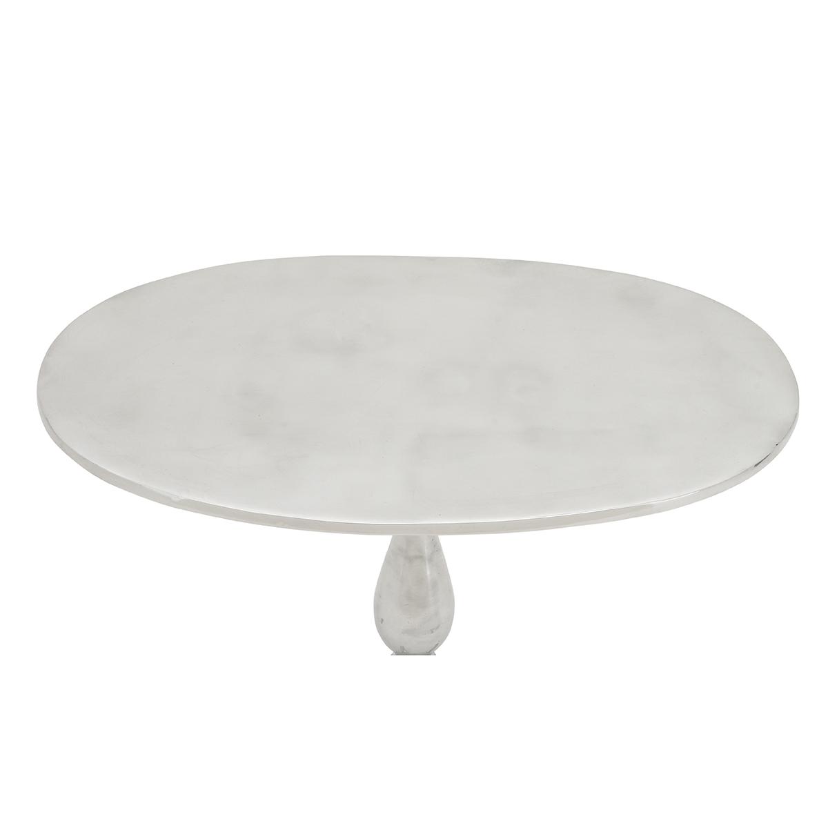 This 9th & Pike® small yet stylish silver accent table made from aluminum with a polished, high-shine finish brings big style to small spaces. The oval top sits on a traditional-styled turned base for an elegant touch. The reflective silver finish adds a bold, lustrous touch to your living room, office, or bedroom.