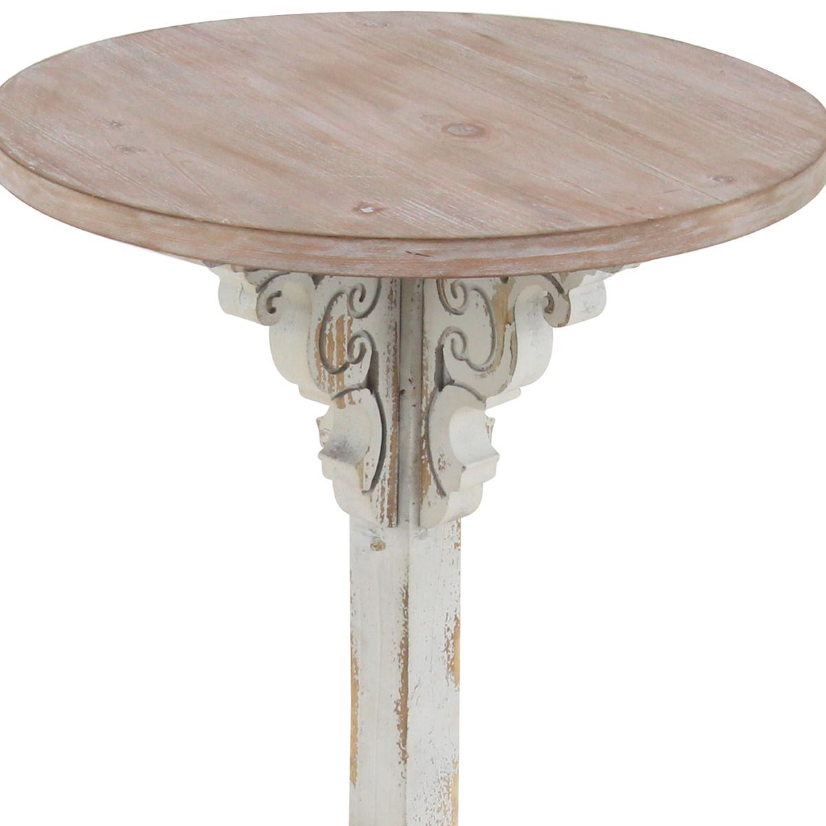 Elevate a rustic-themed home with this 9th & Pike® round wood accent table. The table features a round tabletop made from Chinese fir with a smooth, natural finish. It has a single column stand, and a hand-carved flaring pedestal base with beautifully distressed white paint, further enhancing its old-world charm.
