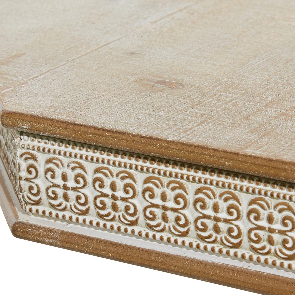 Full of character, this 9th & Pike® wooden accent table brings ornate and unique shapes and design to your home. This wood table features beautiful blonde-colored wood with whitewashing to accentuate the natural swirling wood grain of the fir and red pine woods. The octagon tabletop is embellished with an elegant white and natural acanthus trim and is perched on a large turned column post on an octagon-shaped stacked base.