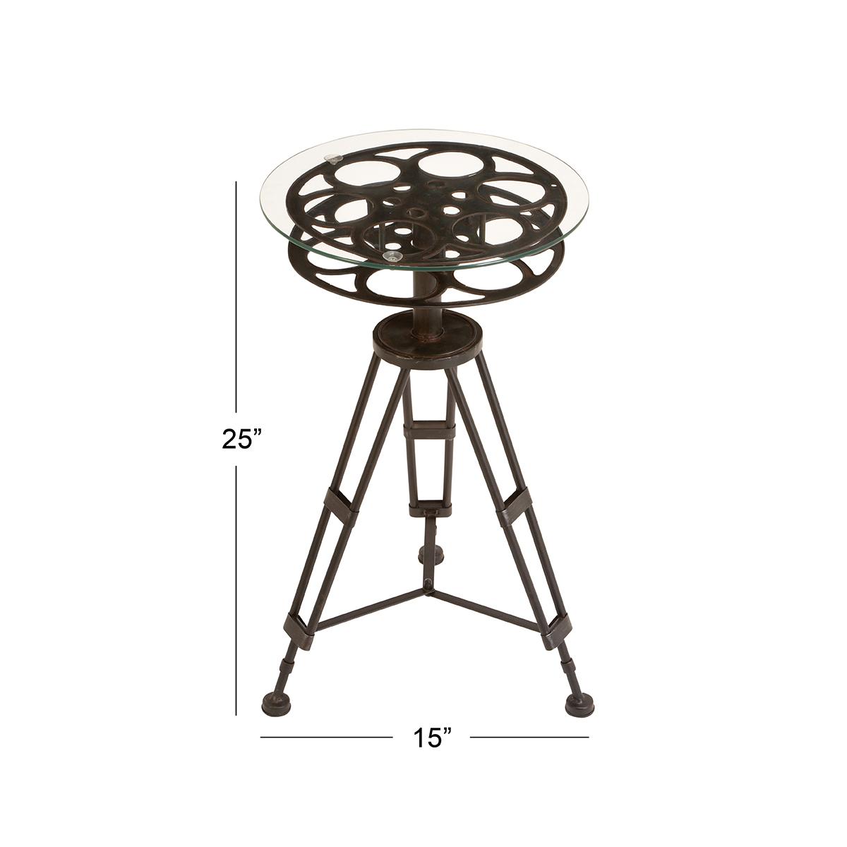 This 9th & Pike® classic camera reel accent table with black finish is a refined and stunning statement piece that gives a rich look to your home. An accent décor piece that features vintage-style film reel design, transparent tempered glass top, and sturdy tripod base.