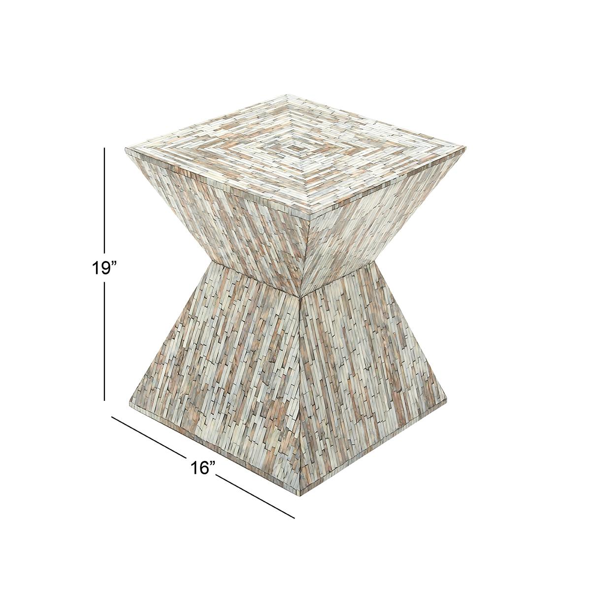 This 9th & Pike® side table with a mussel shell inlay takes the form of an hourglass, making it a suitable piece for contemporary design concepts. Its neat finish makes it a piece of ideal accent furniture along narrow entryways and hallways.This item requires oversize delivery. Please refer to the Order Summary in the Shipping step at checkout for delivery charge.