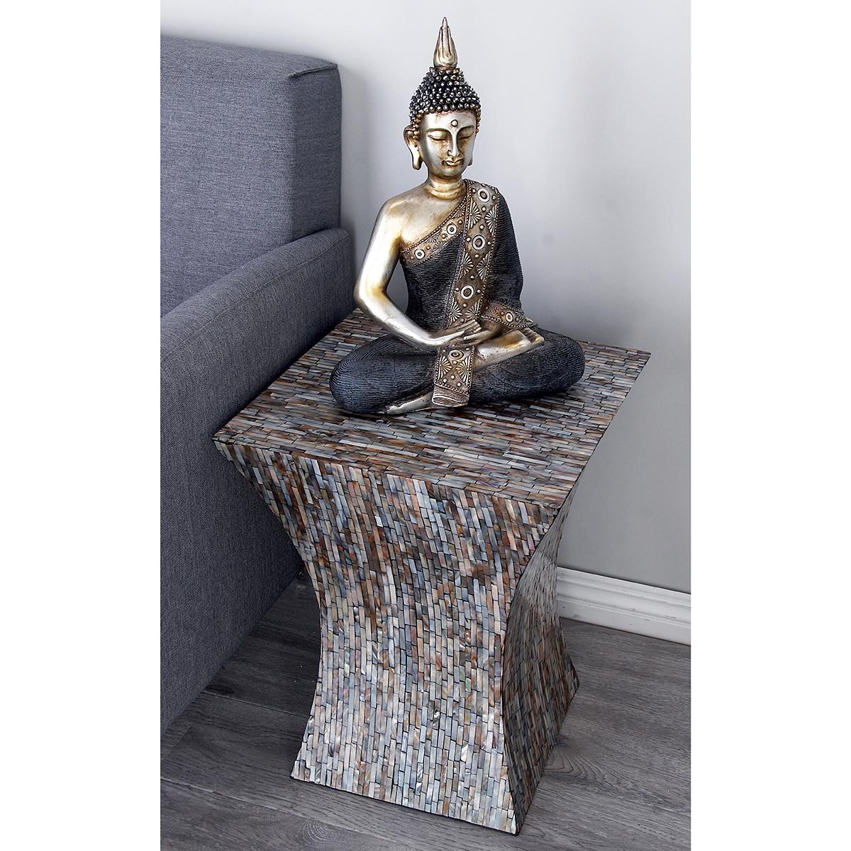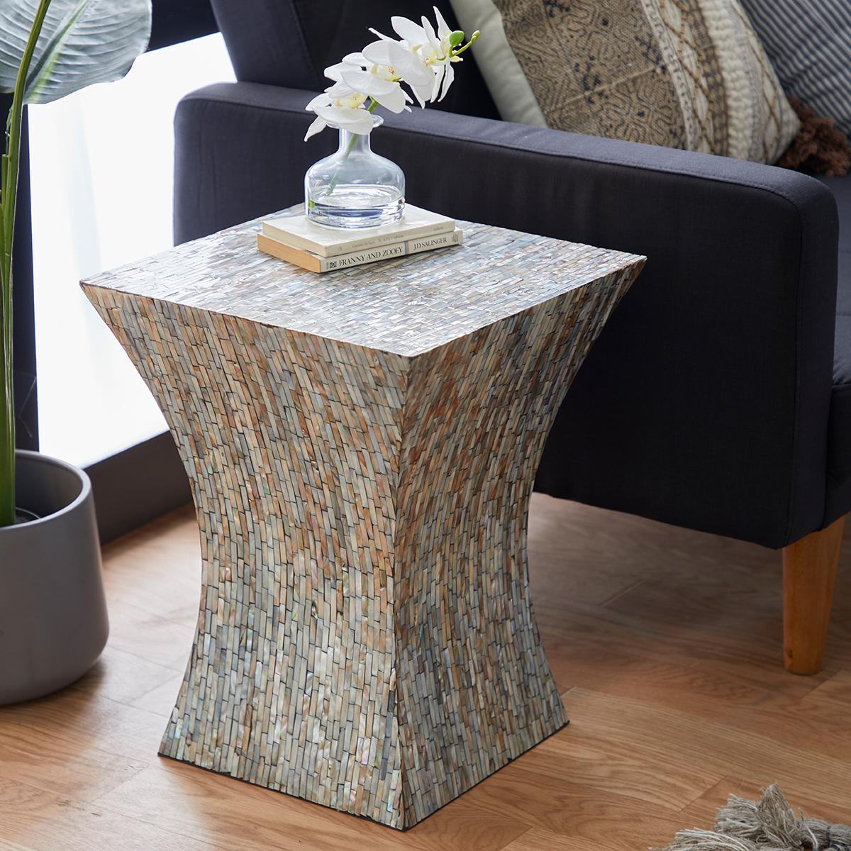 This 9th & Pike® multi-colored geometric shell table is a refined and stunning statement piece for eclectic coastal interiors. It features a reverse-curve plain column constructed from medium-density fiberboard and a mussel shell mosaic inlay.