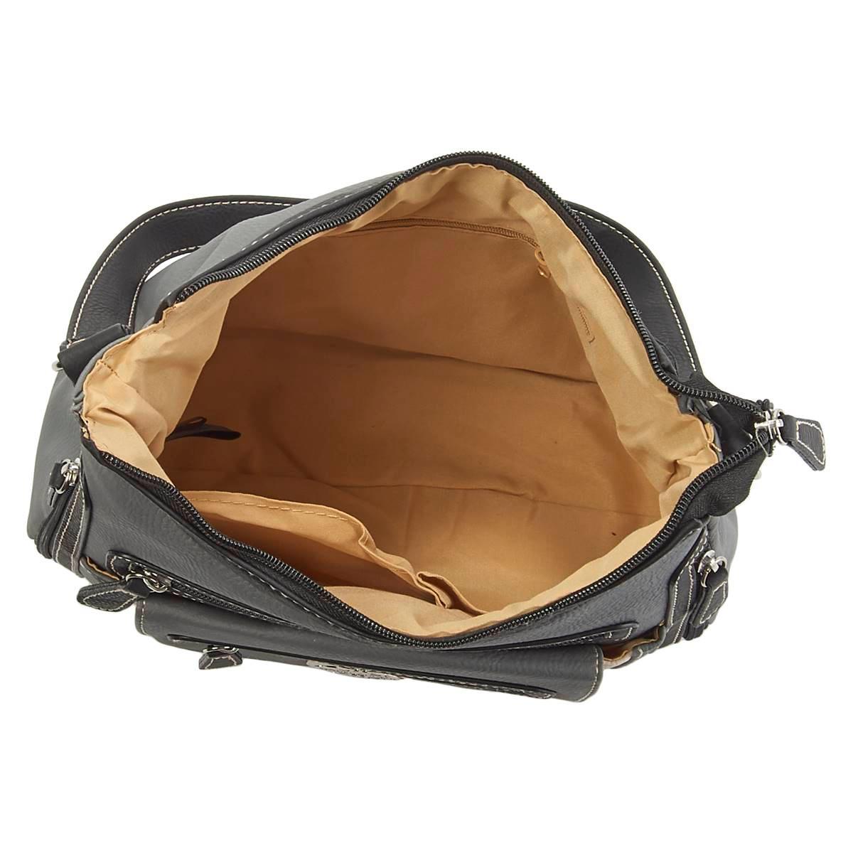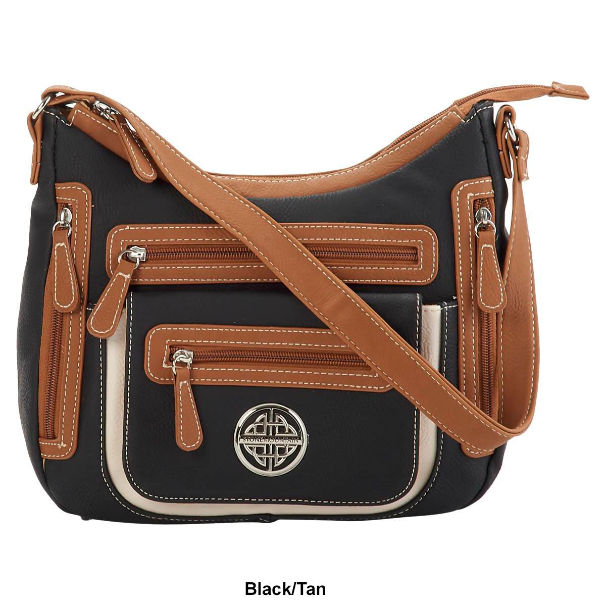 Stay organized during any occasion with this Stone Mountain Mountain Ridge vinyl shoulder bag. This shoulder bag features a single strap, top zip closure, four front pockets, front magnetic snap pocket, three interior pockets, and interior lining.