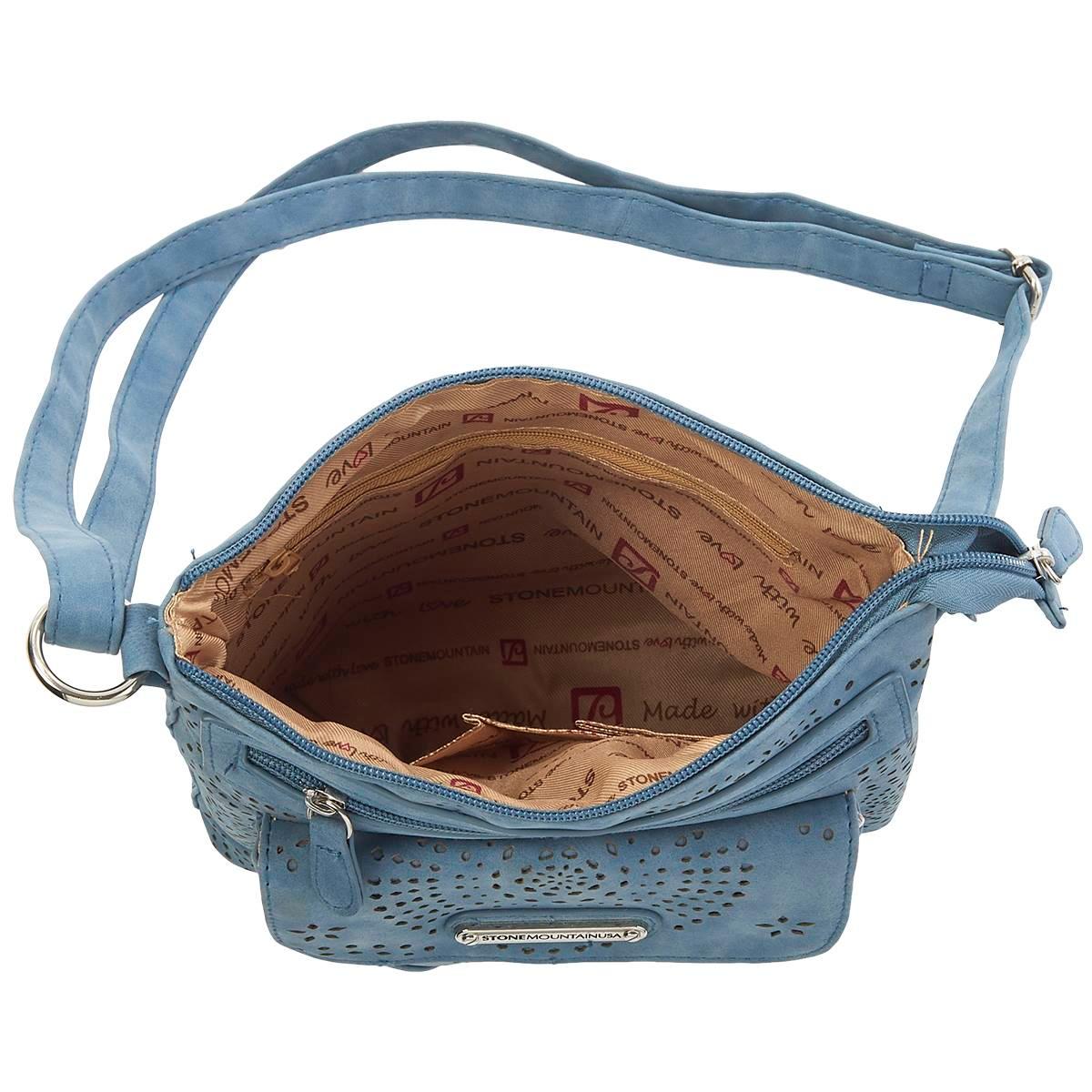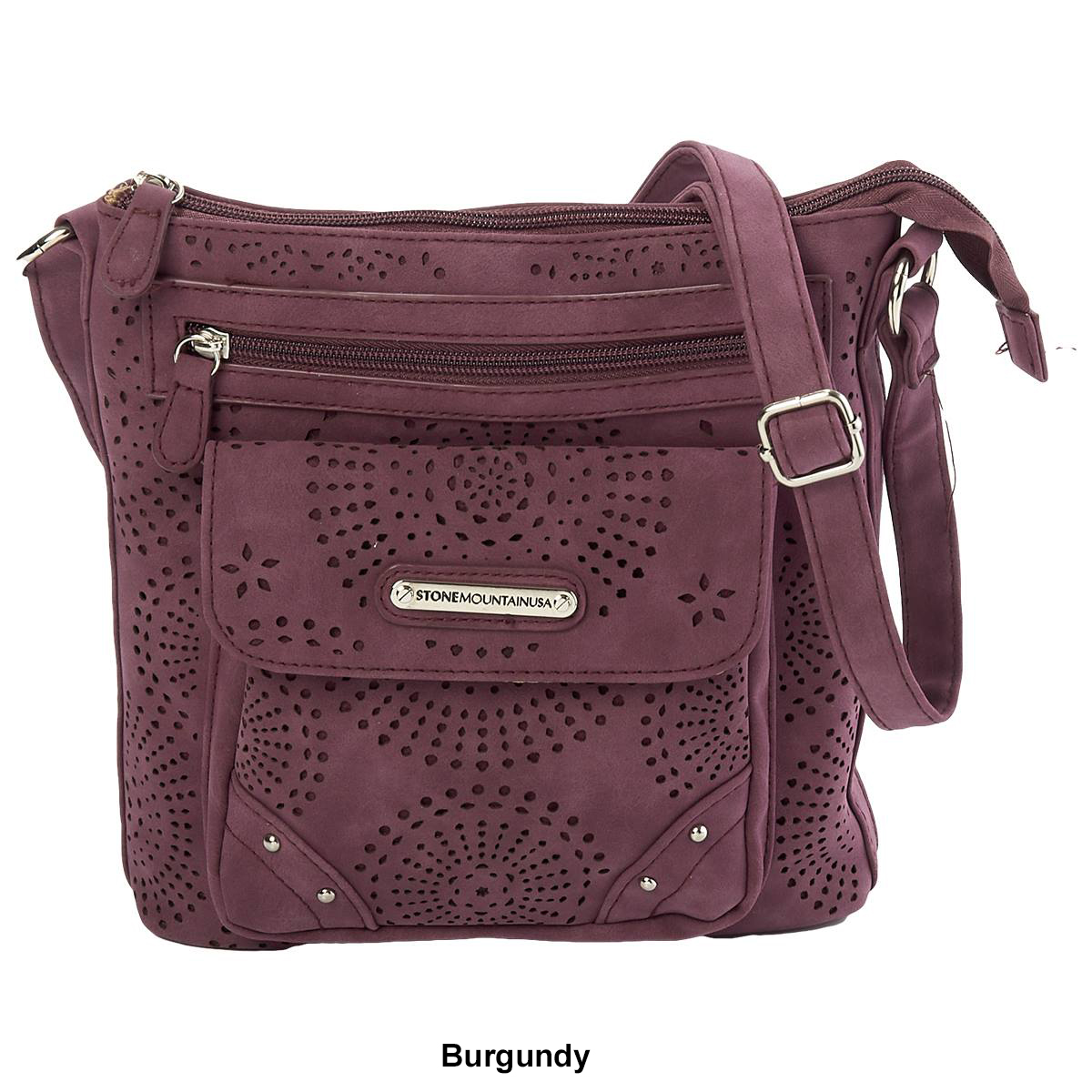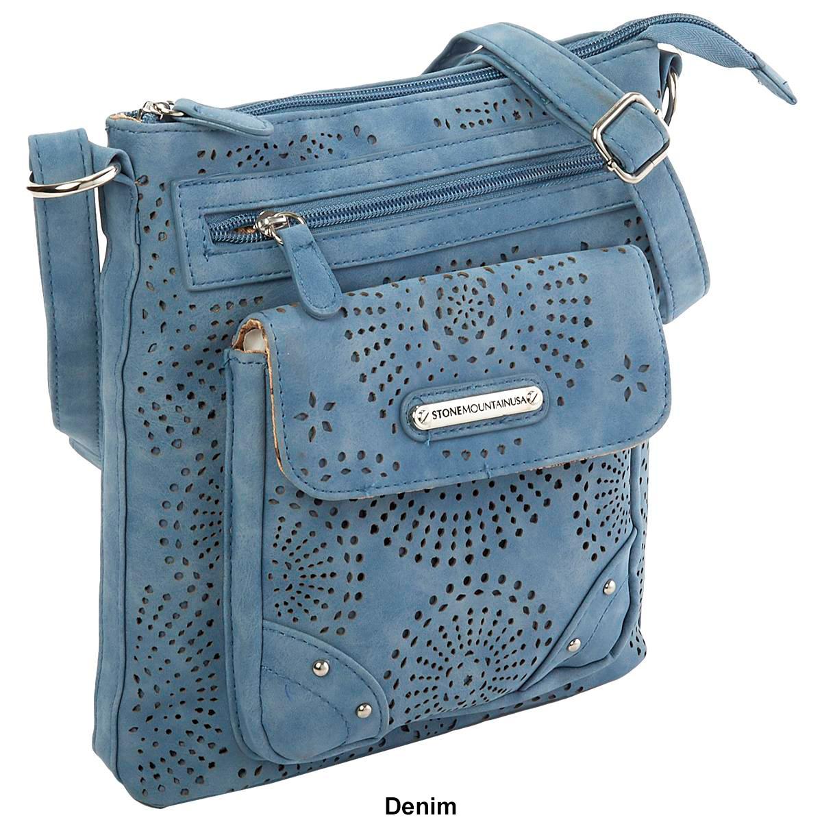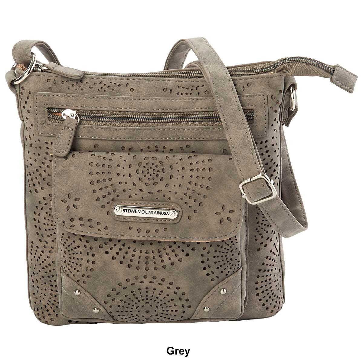 The cute and compact Stone Mountain nubuck vinyl flap crossbody is sure to keep you organized. This crossbody features an adjustable strap, top zip closure, front and back zip pockets, front magnetic snap flap pocket, three interior pockets, interior lining, and a perforated design across the front.