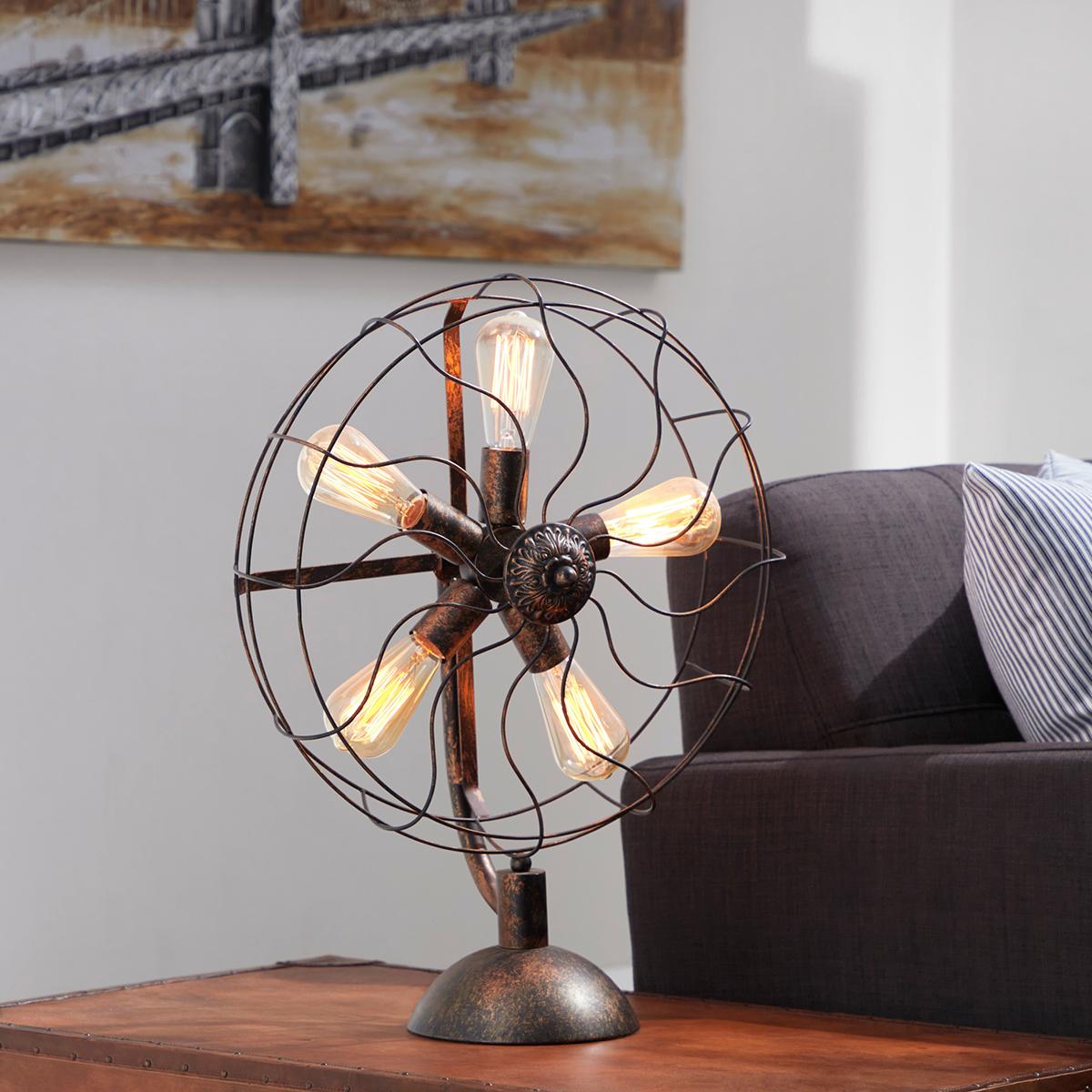 Description You might need to take a second glance at this “fan.” The frame of this 9th & Pike® Black Metal Industrial Fan Table Lamp is made of distressed black iron, which...