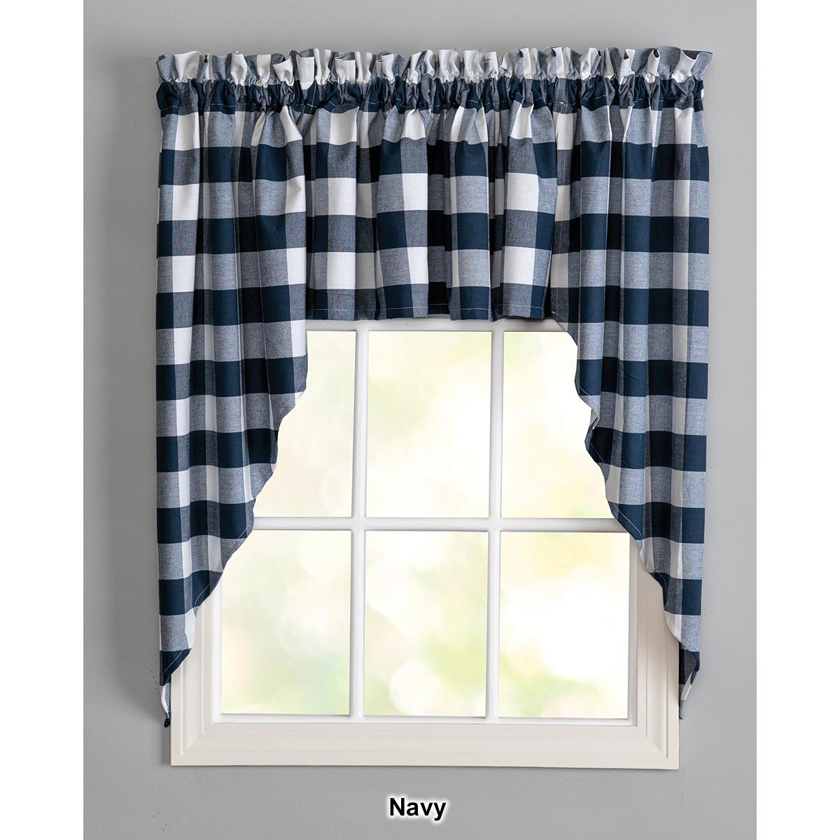 This classic yarn-dyed check swag set hits the ultimate farmhouse vibe and is complemented by a matching tier and valance. This basic check pattern will work in multiple decorating styles.