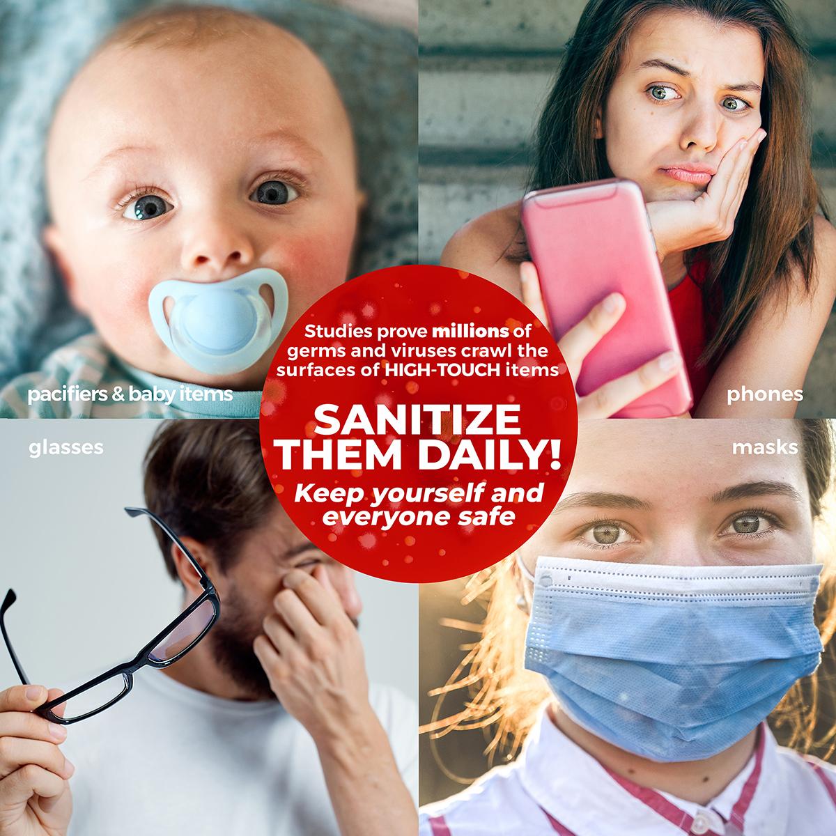 - One-touch sterilization using 2 professional-grade germicidal UV-C lights with 360 degree coverage kills 99.97% of germs and bacteria in under 3 minutes.
