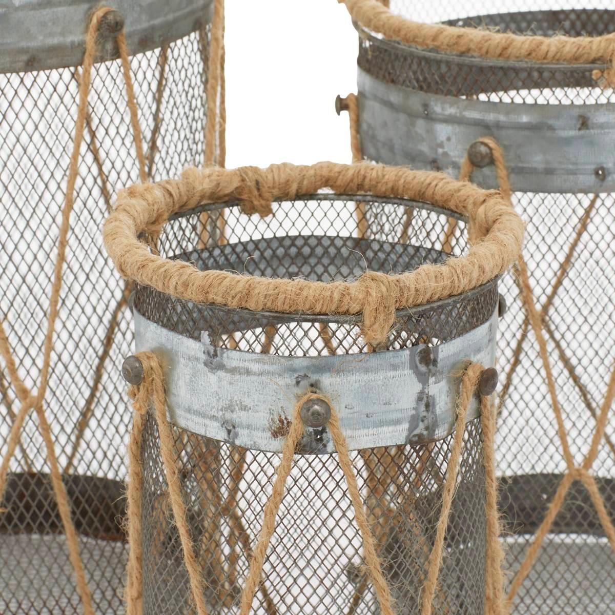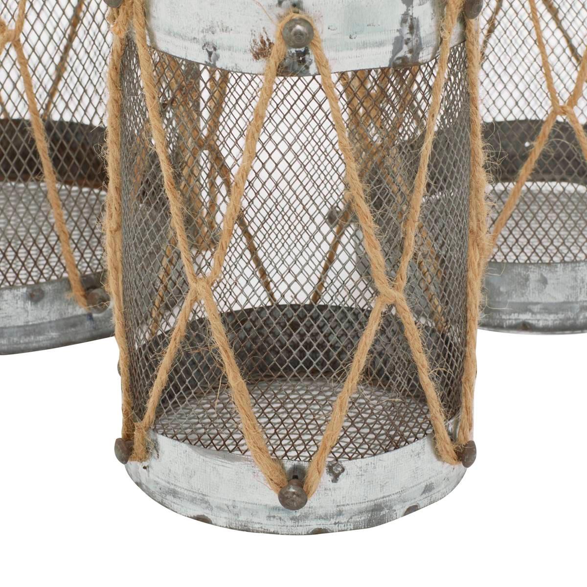 If you´re seeking farmhouse style with stylish rough textures, tie your look together with this 9th & Pike® set of 3 metal hurricane candle holders. It features natural jute rope accents over the metal can-shaped pillar and tea candle holders. The mesh bodies with strips of dimensional galvanized metal look like repurposed farmhouse wares with an added textural touch from the light beige burlap jute rope twine around the rim and diamond-shaped design around the metal. These 11 inch, 9 inch, and 8 inch crafts have "flea market finds" written all over them.