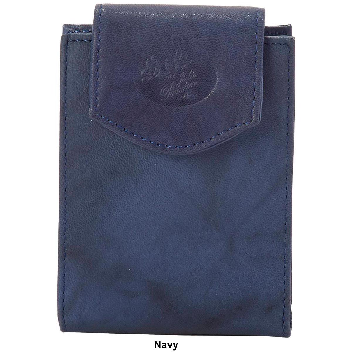 - Interior: 2 slip slots, 2 bill slots, 1 snap coin pouch, 1 I.D. window, 6 clear card slots