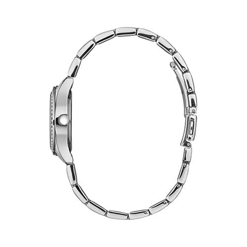 The Womens Caravelle Perfectly Petite Collection sports watch showcases 48 individually hand set crystals, a patterned silver and white dial, a calendar with a second hand, and a double-press fold-over clasp for closure. This watch is also water resistant up to 30 meters. Case Dimensions: 28mm.Style 43M120.Limited Manufacturer´s Warranty.