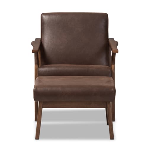 This Baxton Studio faux leather Bianca arm chair and ottoman set will welcome plush comfort into your home with the vintage style. They are constructed of durable rubber wood for exceptional durability and stable comfort and upholstered in distressed brown faux leather to give them a vintage feel. This set features a smooth angular solid wood frame in dark walnut finishing for a nod to mid-century modern design that exudes warmth. The retro modern chair set is built with clean paneled lines on the seat back, bringing relaxing vibes into your living room and complementing your home with lavish style. Wipe with a damp cloth, either with or without a small amount of mild soap (test first), then wipe dry. Made from faux Leather and Rubber Wood.