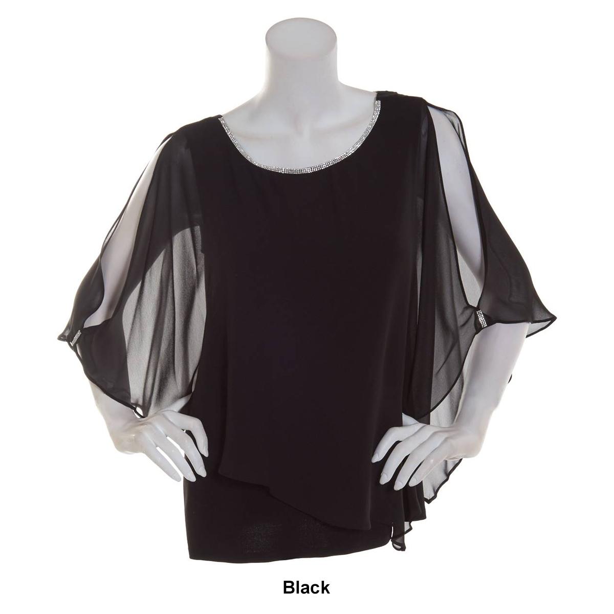 This sophisticated Womens MSK asymmetrical chiffon blouse is perfect for a night out on the town. Features include a rhinestone x-back, a scoop neckline, and split elbow length sleeves.