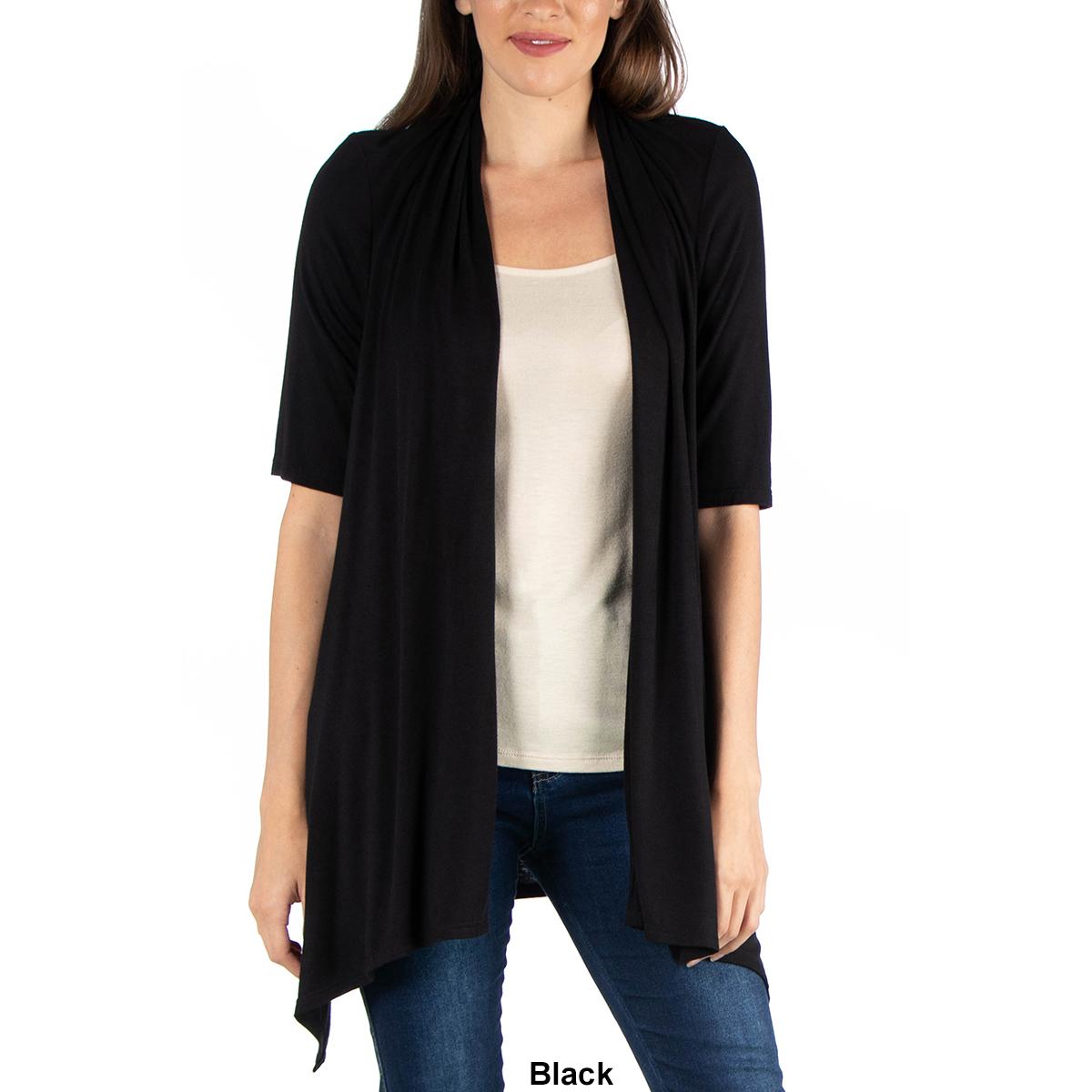Description This Womens 24/7 Comfort Apparel cardigan features a cascading open front with a loose fit designed to flatter any figure. The half sleeves make this piece perfect to...