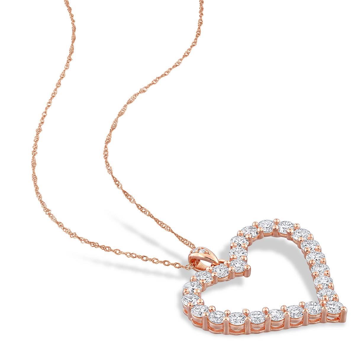 Description This lovely open heart necklace is crafted in rose plated sterling silver and features 26 round-cut, prong-set created white moissanite gemstones in a heart motif....